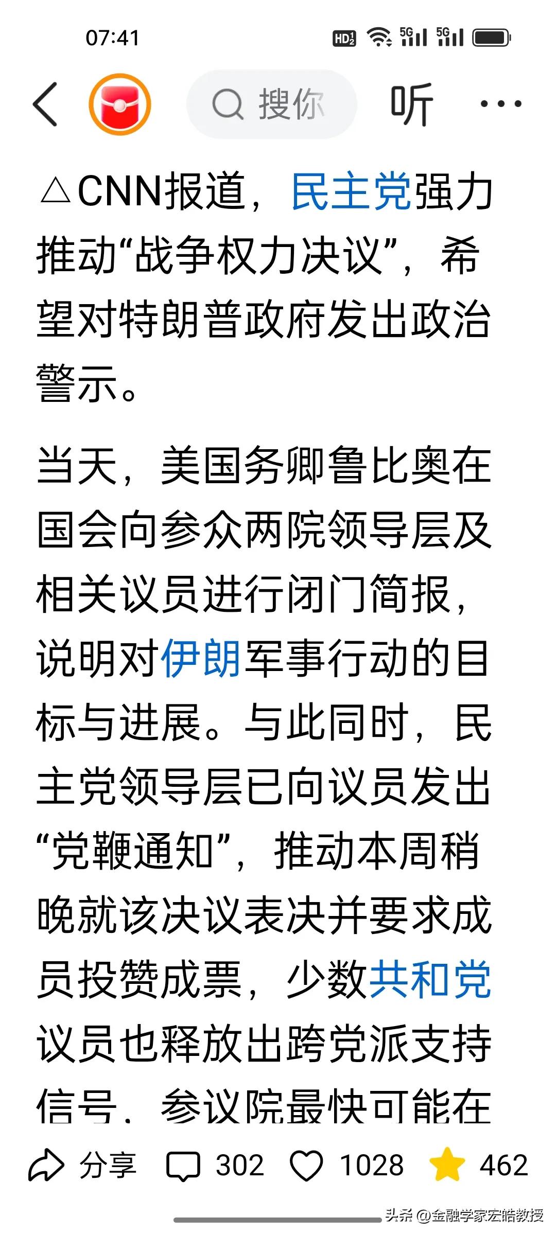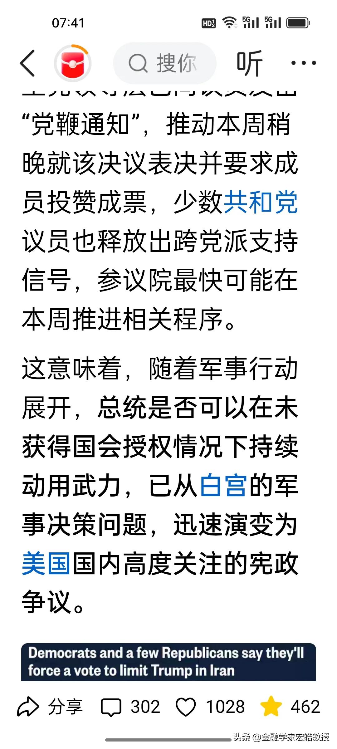 美伊战争或许要草草收场了!参议院最快本周投票給战争紧急“刹车”,特朗普自嗨的“大胜特胜”的持久战,最终可能会在他炫耀一番赫赫战功后无疾而终! 根据《央视新闻》报道,随着美伊局势持续紧张,美国国会正紧急启动“刹车”程序,推动限制总统战争权力的决议,试图限制特朗普在未经授权情况下升级对伊军事行动。 这场仗打不下去,核心原因有三: 1. 宪法权力制衡:美国宪法规定宣战权在国会,而非总统。民主党正强力推动《战争权力决议》,要求特朗普对伊行动必须获得国会授权,否则将被终止。 2. 两党政治掣肘:虽有少数共和党议员跨党支持,但更多议员担忧,无授权的军事行动会让美国陷入战争泥潭,损害国家利益。 3. 制度设计弊端:冷战后多次战争证明,总统单边动武极易失控,而国会的“战争权力刹车”虽能纠偏,却也暴露了美国在重大决策上的内耗与低效。 据悉,参议院最快可能在本周推进投票程序,若决议通过,美伊军事行动或将在数日内迎来明确“刹车”。说到底,这场“刹车”既是给特朗普一个体面的台阶,让他不会太狼狈,也是美国政治制度在战争问题上的一次自我纠偏。但这种内耗式的制衡,又何尝不是一种无奈? 如果真的投票通过,特朗普恐怕要尴尬地承认:自己喊了半天的“无限量武器打到底的强硬”,最终还是被国会的一纸决议,狠狠打了脸。