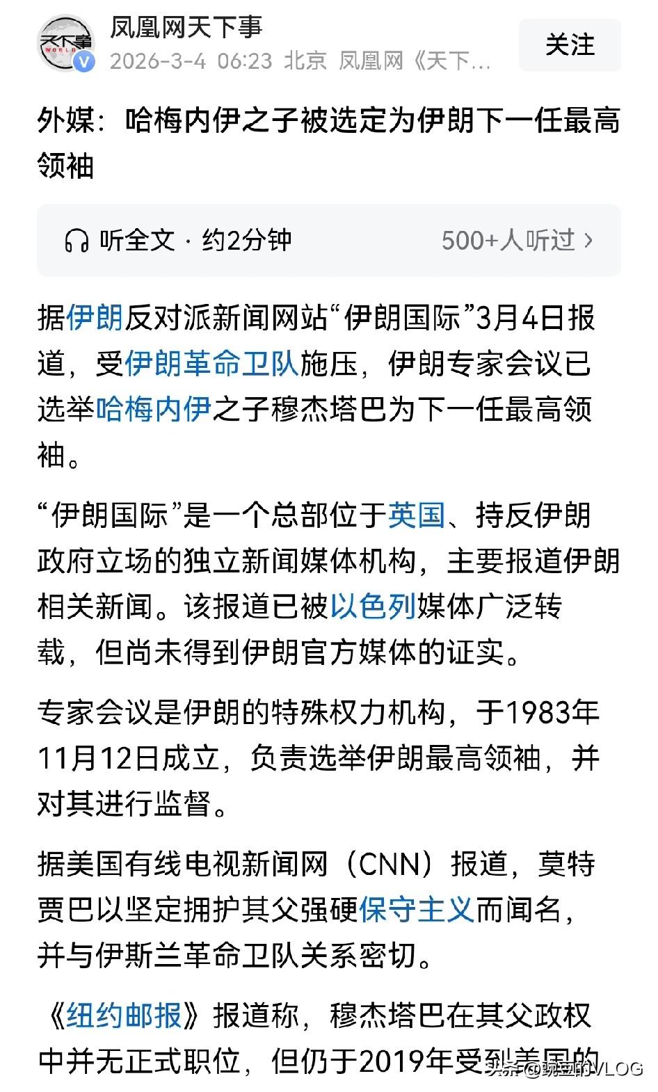 美国和以色列这下麻烦可大了,哈梅内伊之子被选为伊朗新领袖。…[捂脸] 哈梅内伊本来属于伊朗强硬派里面较温和的,但美以仍容不下他。 这回好了,伊朗媒体称哈梅内伊之子已被选定为伊朗新最高领袖。 这可是国仇家恨的双重叠加。 伊朗选定哈梅内伊之子更像对美国和以色列展现态度,不死不休… 朋友们,你们对此事怎么看? 欢迎大家在评论区探讨,留言…[送心]