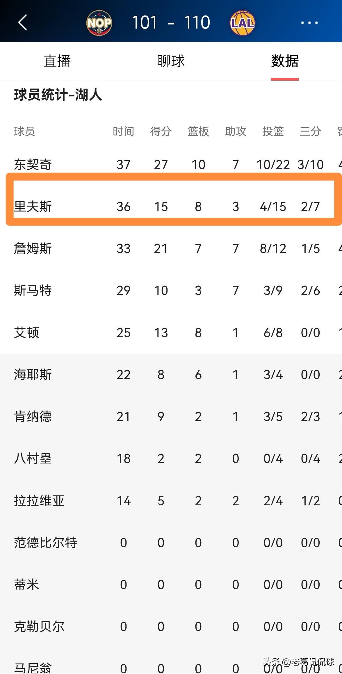 湖人三当家里弗斯的调整能力真是太强了!在今天湖人主场以110:101战胜鹈鹕的比赛中,里弗斯在上下半场比赛中展现出了非常强的自我调整能力。 全场比赛下来,里弗斯首发出战36分钟,投篮15中4,其中三分球7中2、罚球5中5得到15分8篮板3助攻2抢断2盖帽。值得一提的是,里弗斯在上半场比赛仅仅得到2分的情况下,在下半场比赛中豪取13分,最终帮助球队赢下了比赛。 实事求是的说,里弗斯在下半场比赛中的及时苏醒是湖人能够获胜的重要原因之一。