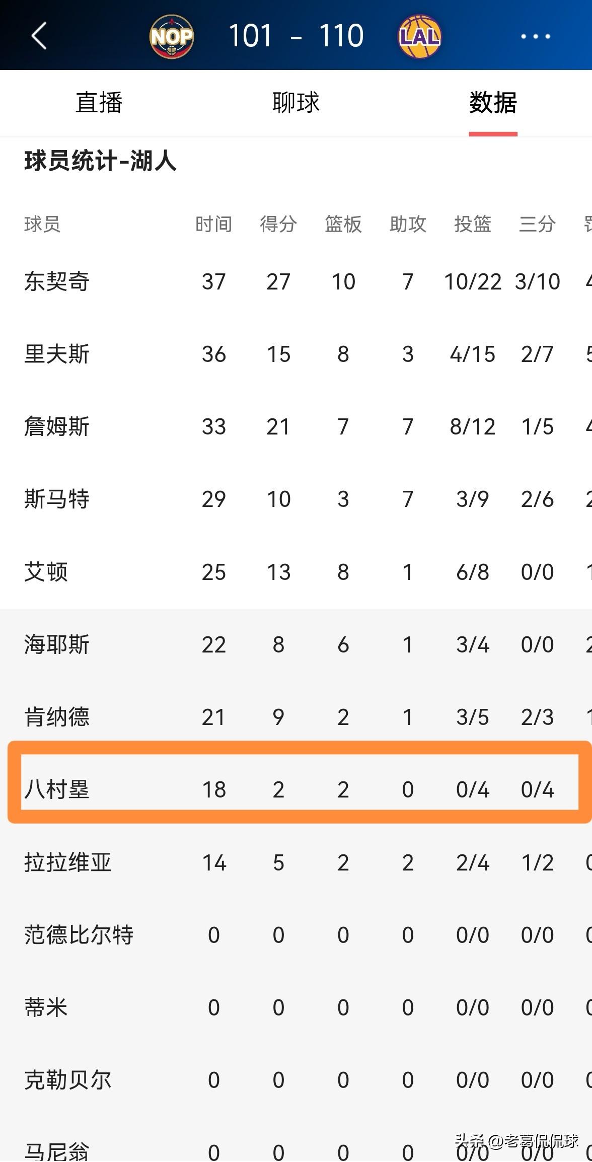 湖人大将八村塁真是无药可救了!虽然今天湖人在主场以110:101战胜鹈鹕,但是八村塁在投篮端的表现非常的糟糕,他在替补出战的18分钟里,投篮4中0,仅仅依靠罚球得到2分,他的场上正负值为-6。 值得一提的是,在最近一段时期里,八村塁已经接二连三的在进攻端迷失自我了,照这样发展下去的话,八村塁距离被主帅雷迪克弃用已经越来越近了。