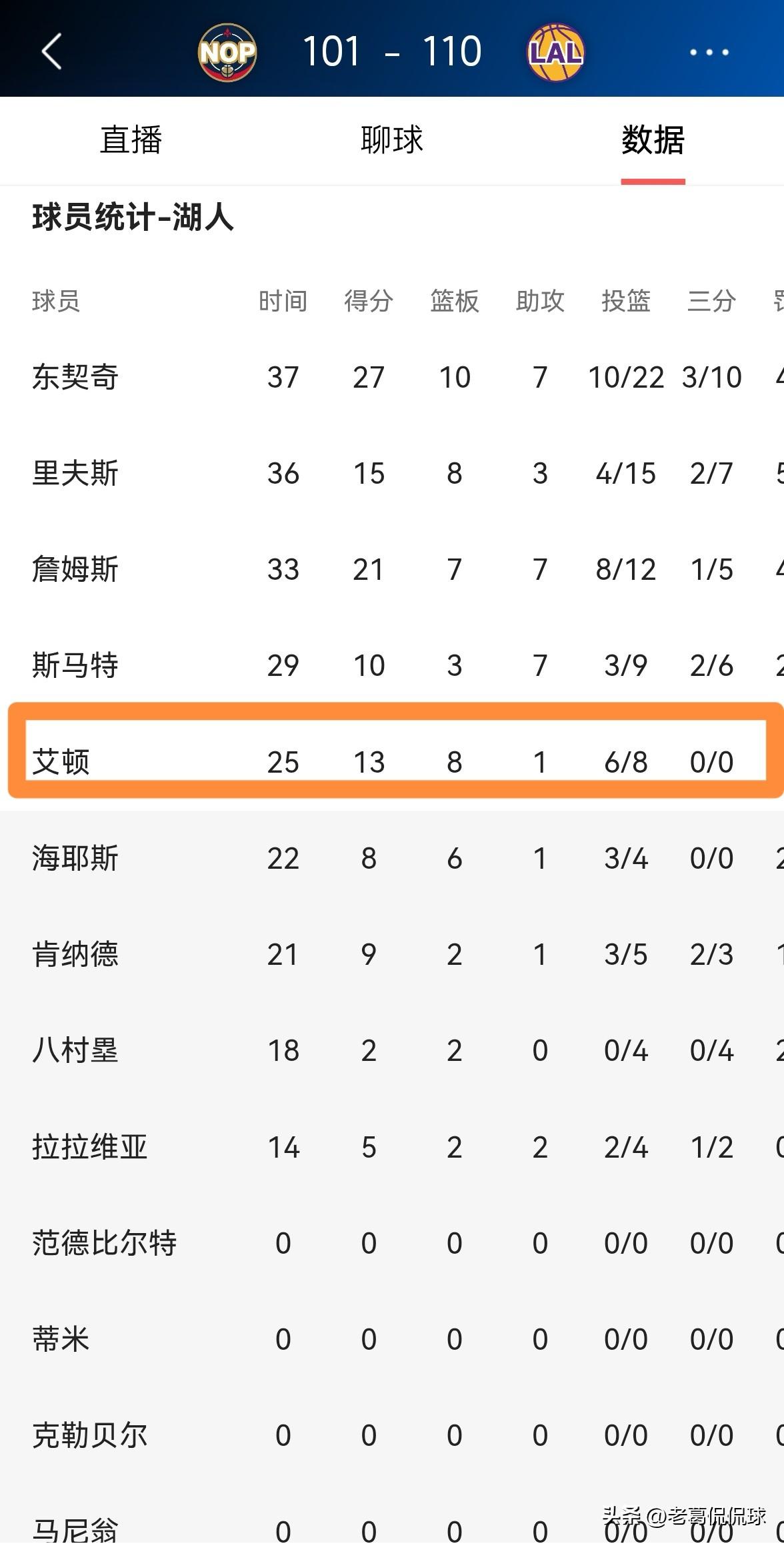 湖人中锋艾顿在关键时刻再次惨遭弃用!在今天湖人主场以110:101击败鹈鹕的比赛中,艾顿在第四节比赛的关键时刻再次遭到了雷迪克教练的弃用,海斯成为了更受雷迪克教练重用的人。 整场比赛下来,艾顿首发出战25分钟,投篮8中6,其中罚球1中1得到13分8篮板,还有2次失误和4次犯规,他的场上正负值为全队最低的-7。 作为一名中锋,艾顿在25分钟的上场时间里仅仅博得了1次罚球,这足以证明艾顿在篮下是多么的软弱。