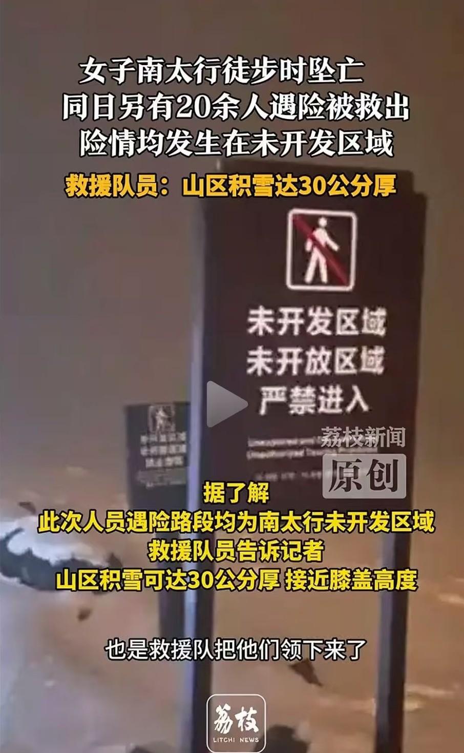 40多岁反穿野线坠亡,要有孩子也就刚成年,以身涉险,光胆子大可不行啊! 张沟梯坡陡,边上就是悬崖,下雪后连台阶都看不见。 往下走结冰路面,冰爪也不是万能的,一着不慎分秒钟人就能掉下去。 徒步是很好的运动,但别往“禁止”的地方跑,尤其天气不好的时候。 更年还未开始命就没了,上有老下有小的年纪,留给家人只有深深的伤痛。