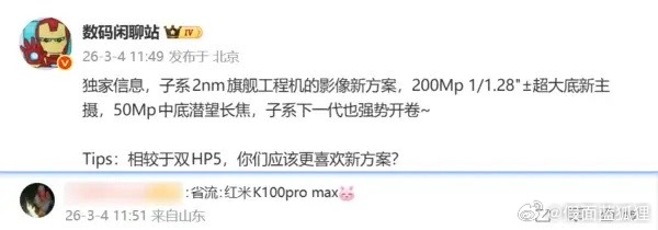 数码闲聊站 REDMI K100系列影像配置曝光 搭载2亿像素超大底主摄