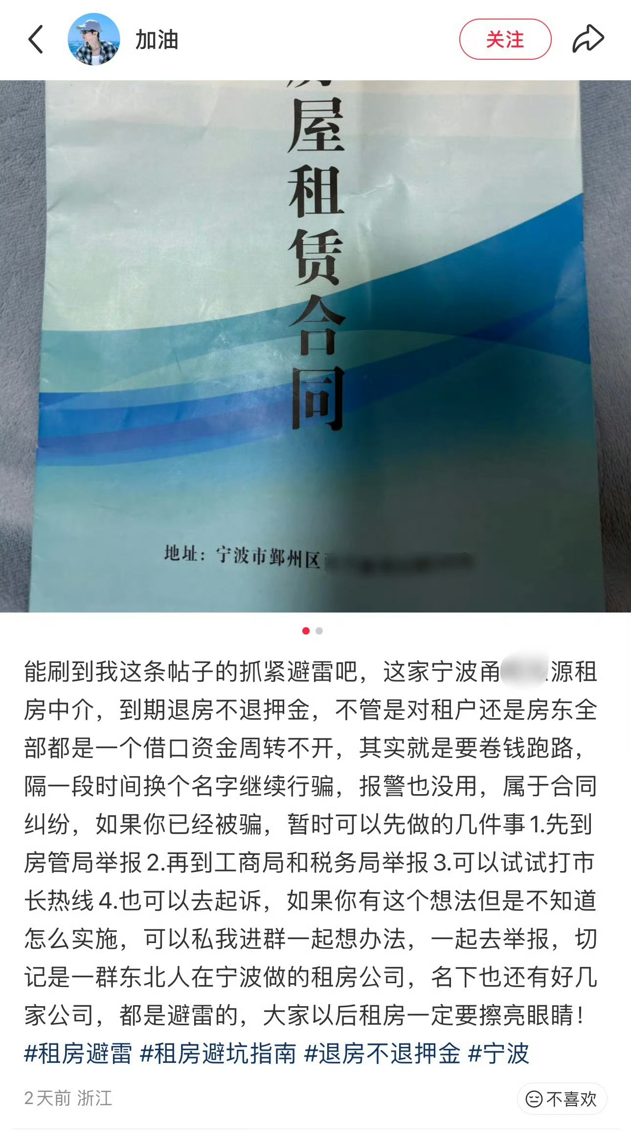 宁波网友喊话避雷一租房中介不退押金 ,什么情况,有没有碰到同样情况的朋友?网友“加油”在小红书发帖:能刷到我这条帖子的抓紧避雷吧,这家宁波甬某某源租房中介,到期退房不退押金,不管是对租户还是房东全部都是一个借口资金周转不开…看了下评论区,也有其他人出来维权!
