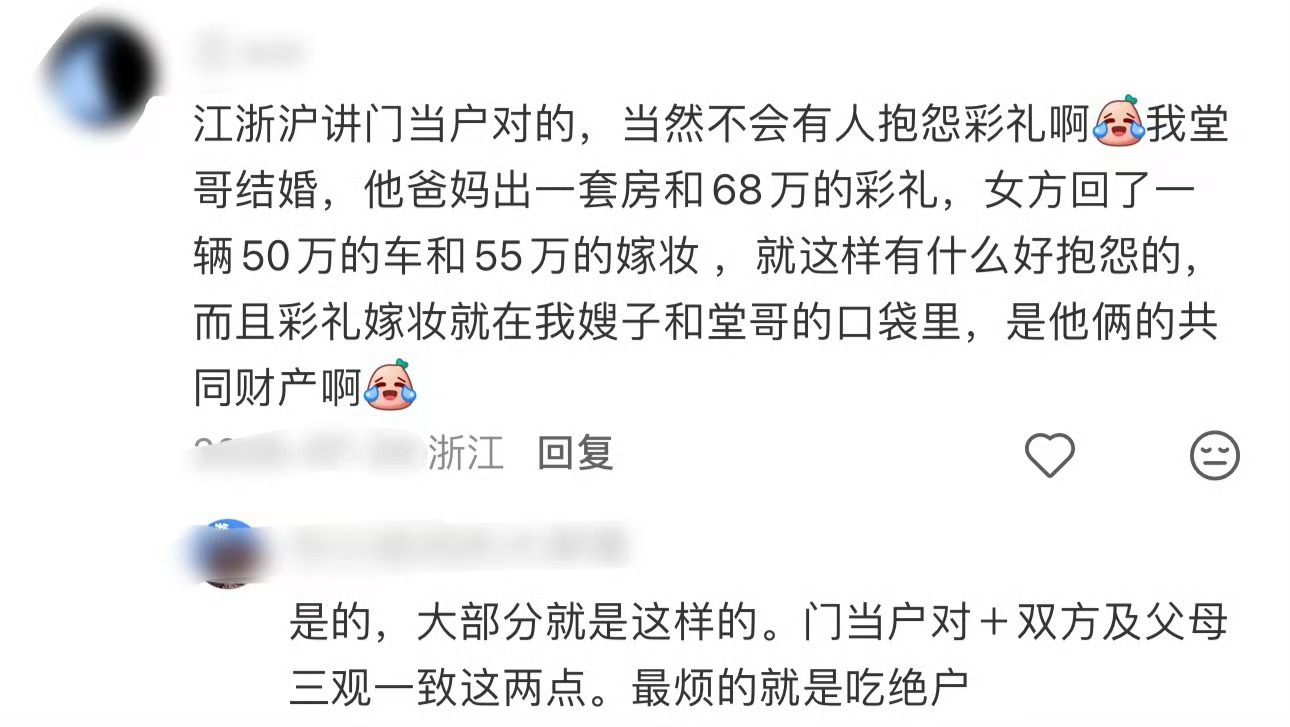 为什么江浙沪没什么人抱怨彩礼少 因为在江浙沪大家都知道结果就是双方家长一起爆金币💰反正都是给小家庭结个婚就突然有钱了,是伐?