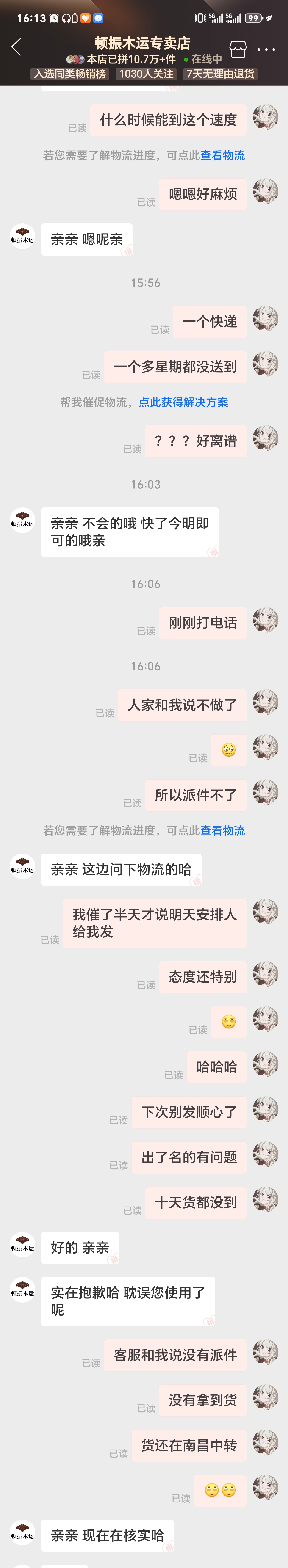 理解是大件,但是23号发的货,今天3月4号,11天了,三天前就打电话催叫帮我派件,昨天和我说会帮我安排司机送过来,得今天打电话说还得缓几天…行慢就慢吧,反正离我那不远我就说开车去拿,得了到中转站,货找不到了,所以呢...我们消费者就活该为你们的错误买单咯??之前真没遇过这个快递公司,好遇到了…