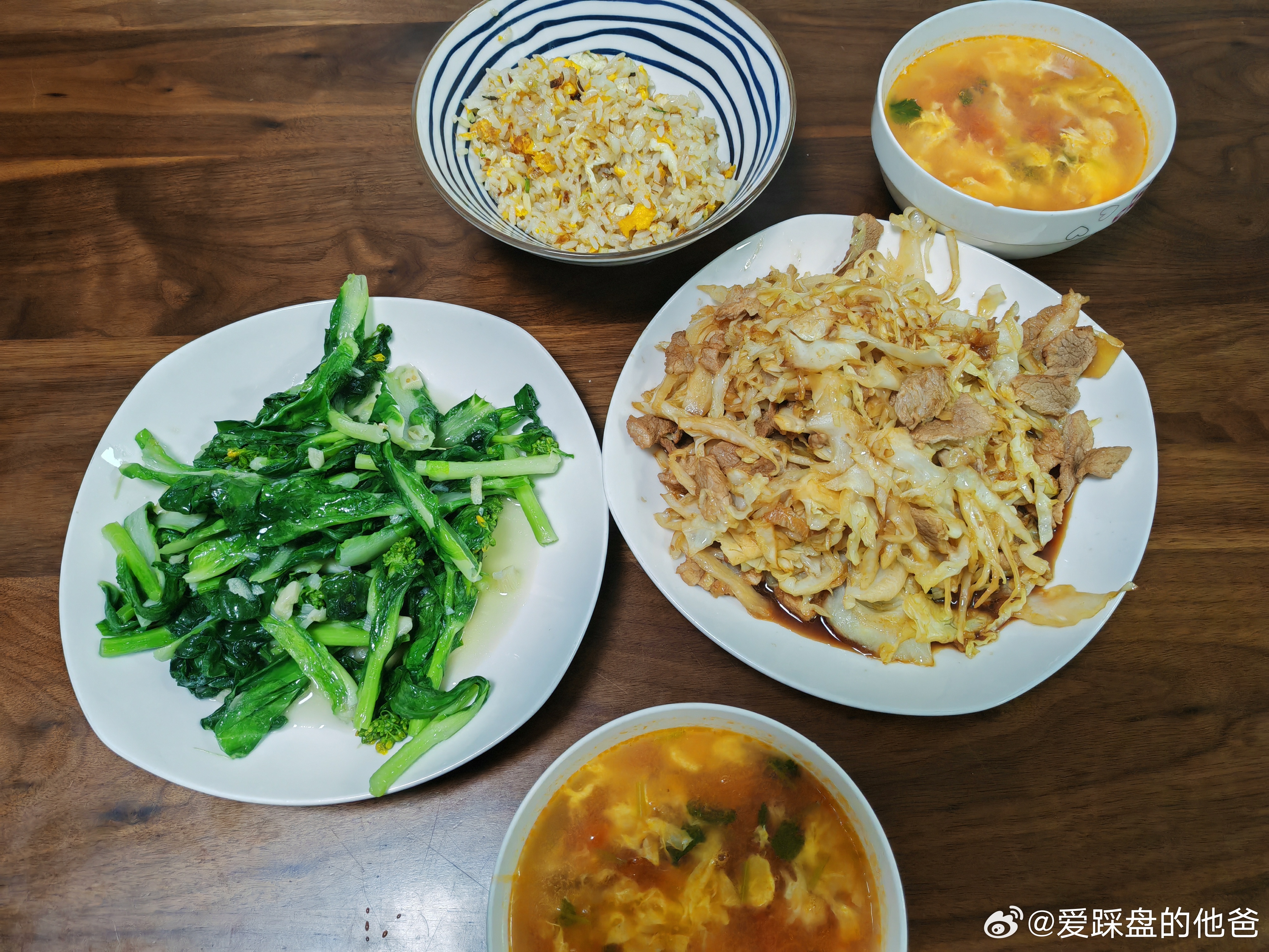 开饭啦,蛋炒饭,蒜蓉菜心,包菜炒肉,西红柿鸡蛋汤。