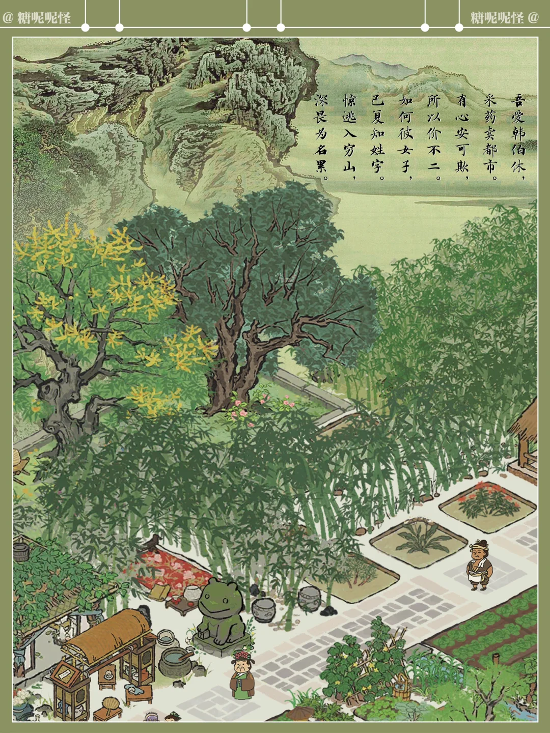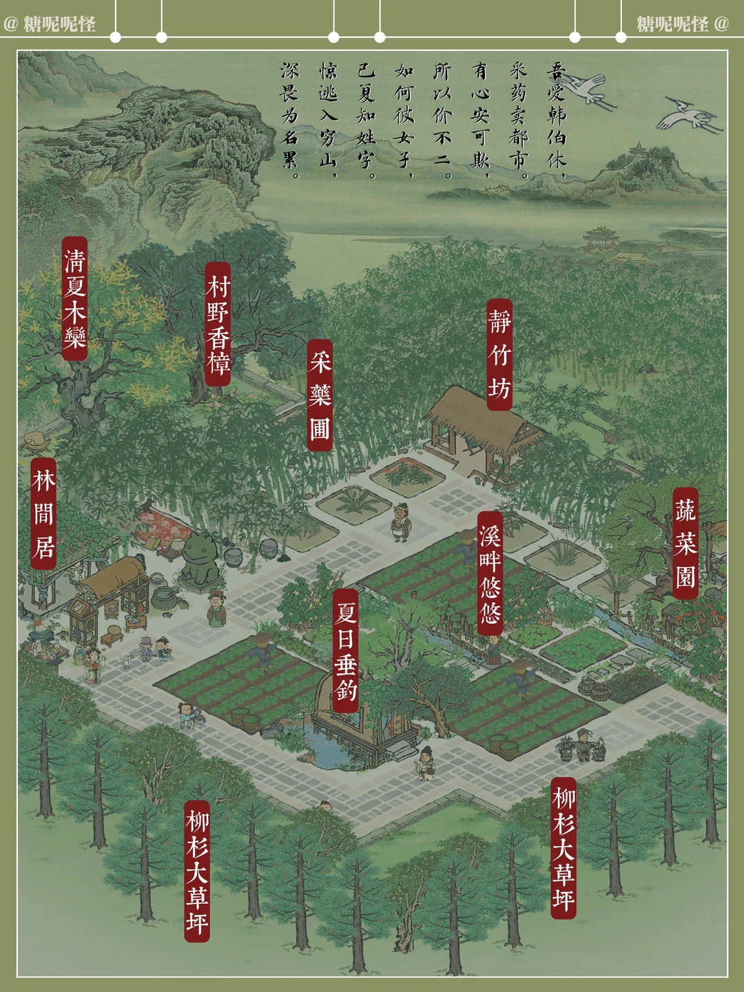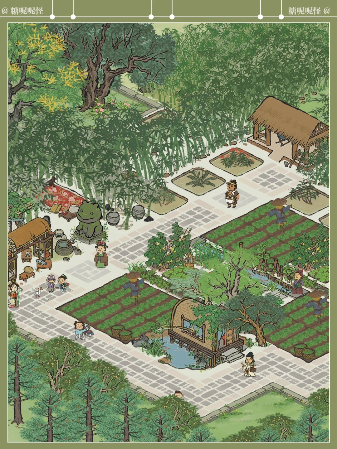 糖大人听说了东坡先生的名句 在东坡先生入住杭州的第三年,终于在闲暇之余,斥巨资(桃花村攒攒攒)在东坡先生家后面打造了翠竹园,一片茂密的竹林、枝叶舒展的香樟树、枝繁叶茂的栾树围合起来,竹林中设静竹坊,草药田沿着建筑两侧展开,两陇竹林之间开辟出竹廊,最顶端空间扩大,形成竹庐,劳作之余可在此处歇息……周边种植各类草药,花开时节,药香袭人……中部空间设置菜地、蔬菜园,与道路衔接,方便采摘…… 希望东坡先生能在这个小小的世界里过的舒心自在……