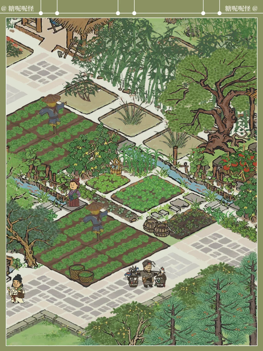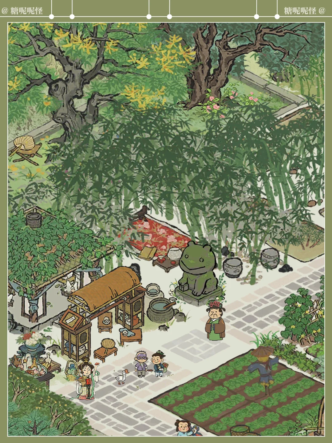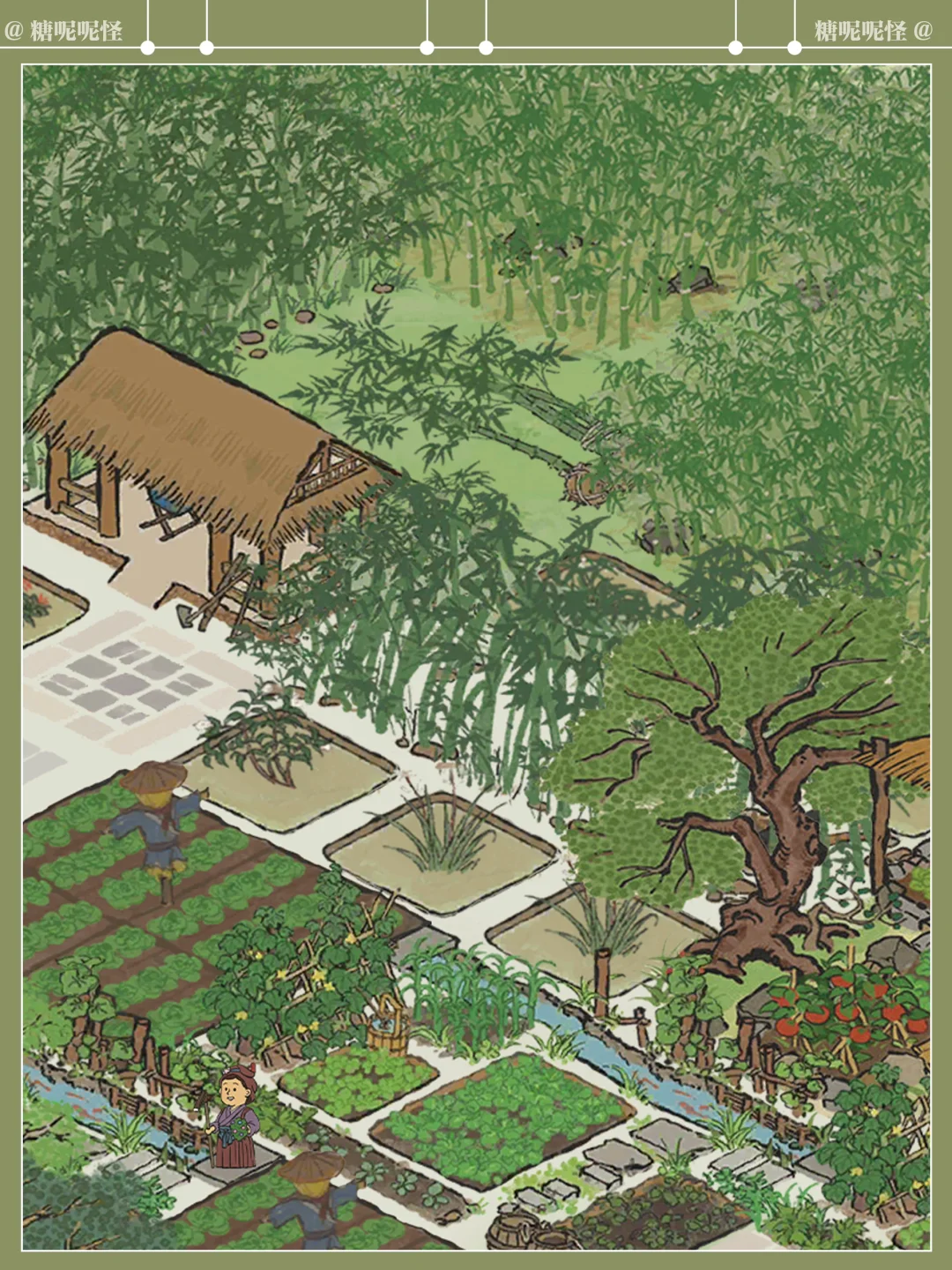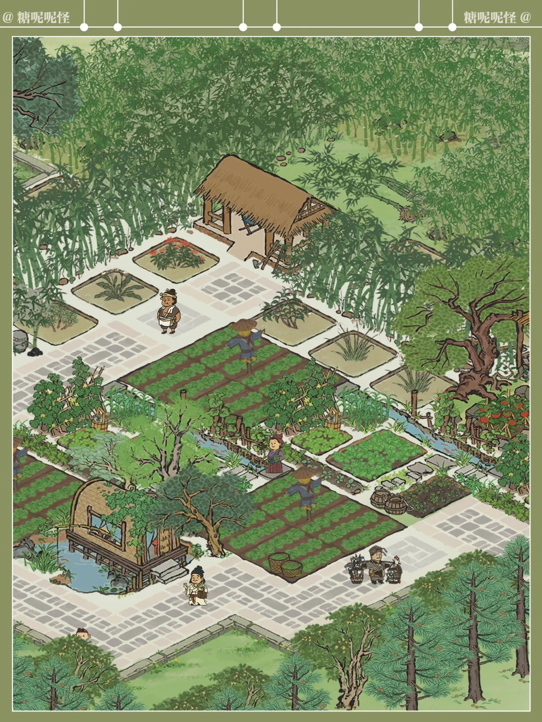 糖大人听说了东坡先生的名句 在东坡先生入住杭州的第三年,终于在闲暇之余,斥巨资(桃花村攒攒攒)在东坡先生家后面打造了翠竹园,一片茂密的竹林、枝叶舒展的香樟树、枝繁叶茂的栾树围合起来,竹林中设静竹坊,草药田沿着建筑两侧展开,两陇竹林之间开辟出竹廊,最顶端空间扩大,形成竹庐,劳作之余可在此处歇息……周边种植各类草药,花开时节,药香袭人……中部空间设置菜地、蔬菜园,与道路衔接,方便采摘…… 希望东坡先生能在这个小小的世界里过的舒心自在……