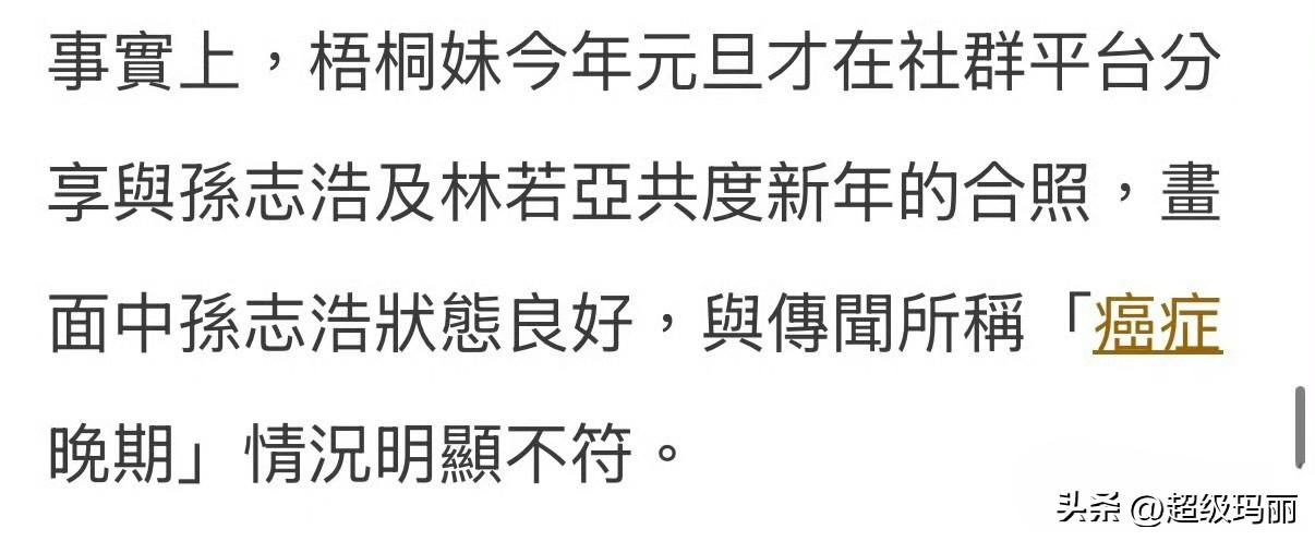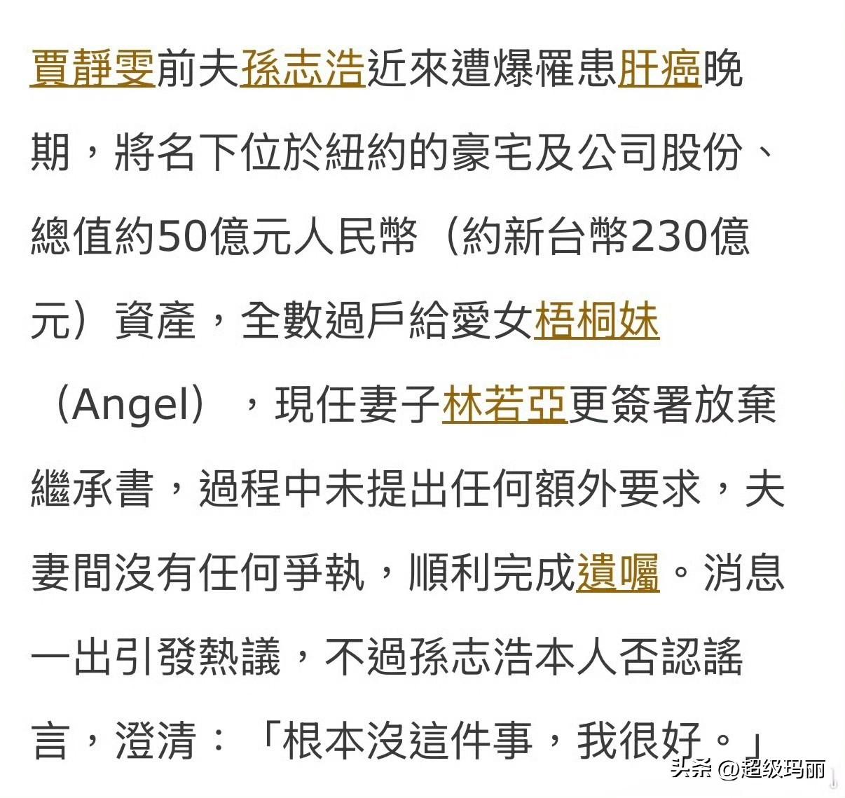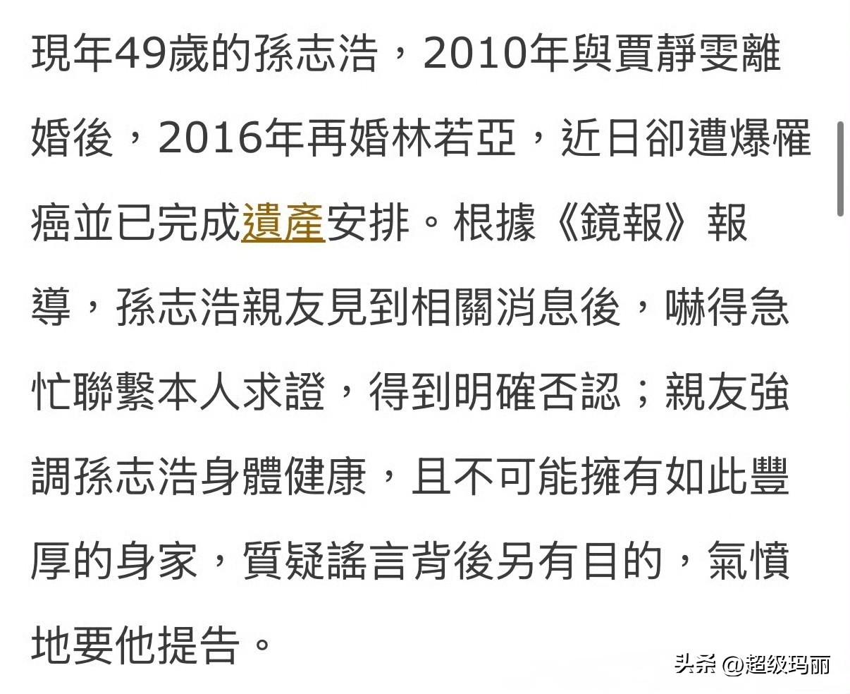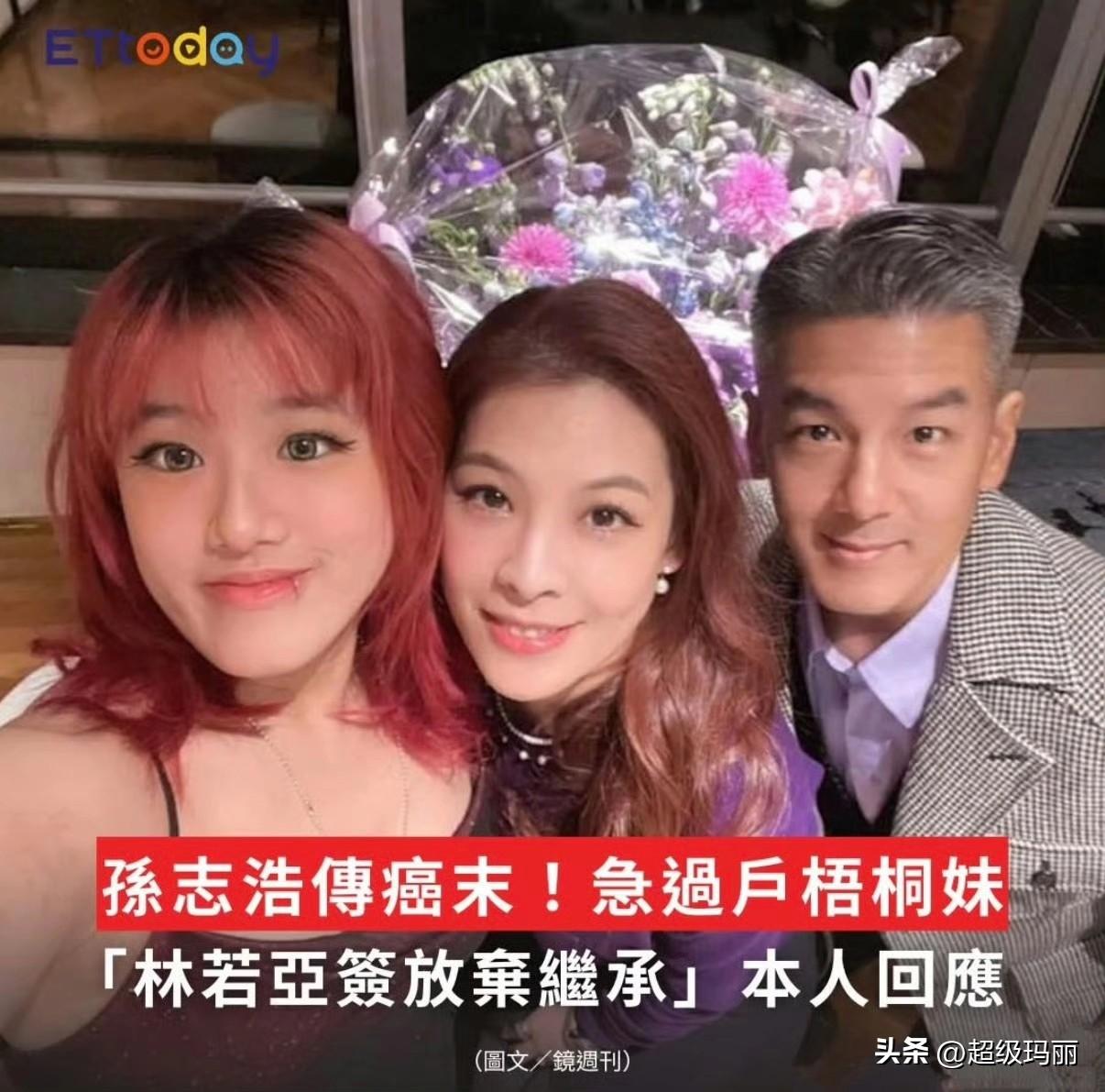 今天台媒说孙志浩患肝癌晚期,所有资产全归女儿梧桐妹,现任妻子林若亚放弃继承。孙志浩本人回应了