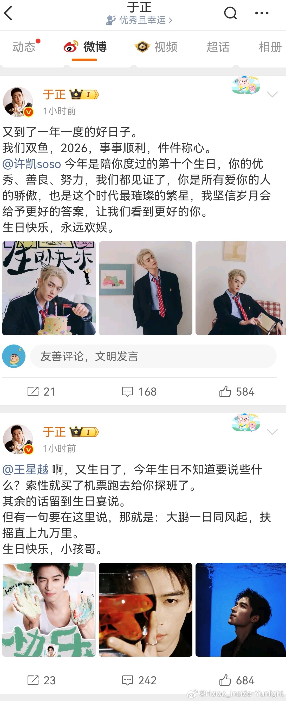 于正签人难道看生日吗,许凯和王星越居然是同一天生日,身为老板的于正也是很端水,前后脚给两人都发了祝福