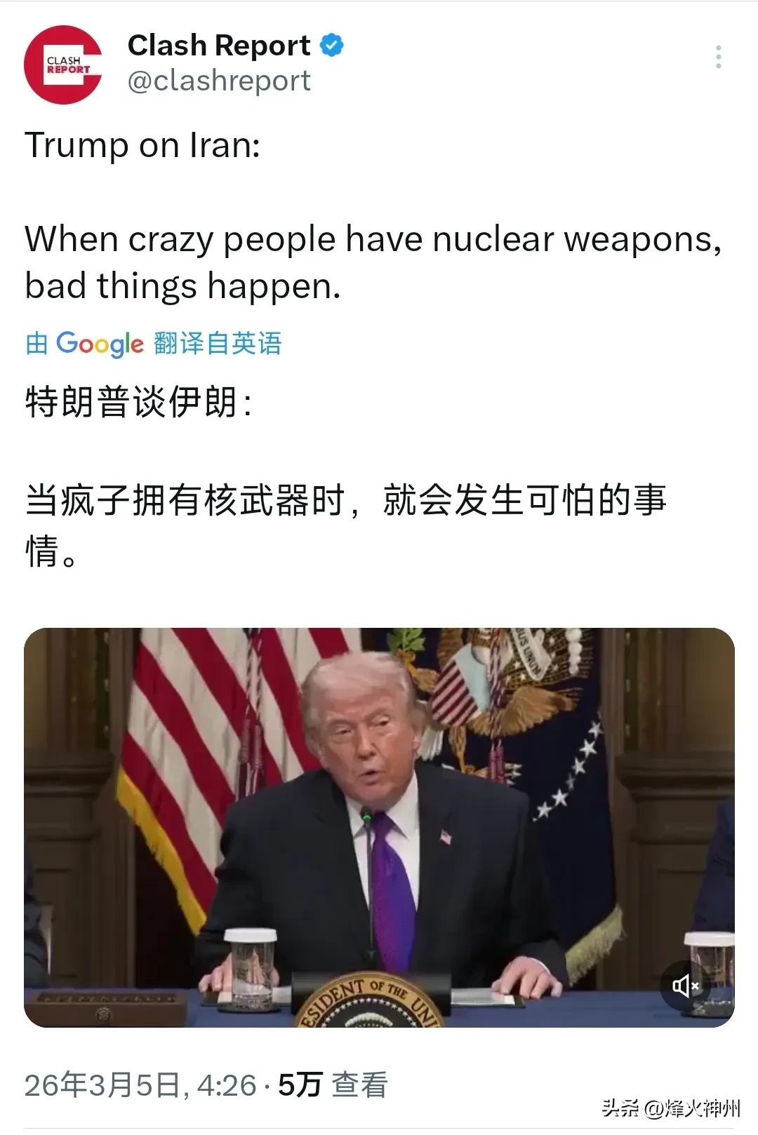 特朗普今天(北京时间3月5日)接受采访时再次谈到伊朗:“如果我们不先动手,他们就会对以色列下手。”“当疯子拥有核武器时,就会发生可怕的事情。” 评几句: 特朗普再度大放厥词,以“疯子拥核”污名化伊朗,用“先下手为强”为军事打击制造借口,这番言论充满煽动性与虚伪性,是典型的战争煽动。 伊朗一贯坚持和平核立场,明确拒绝发展核武器,所谓“核威胁”完全是美国编造的谎言。特朗普将伊朗妖魔化,本质是为美以军事行动洗白,把侵略包装成“自卫”,把霸权施压美化成“反恐”。 以“保护以色列”为幌子,行干涉中东、操控能源之实,是美国惯用伎俩。特朗普无视地区和平诉求,用极端言论煽动对立、升级冲突,只为满足自身政治私利与霸权野心。 这种颠倒黑白的话术,掩盖不了侵略本质。靠抹黑发动战争、靠谎言操控舆论,只会加剧地区动荡,让中东人民深陷苦难,也终将被国际社会唾弃。