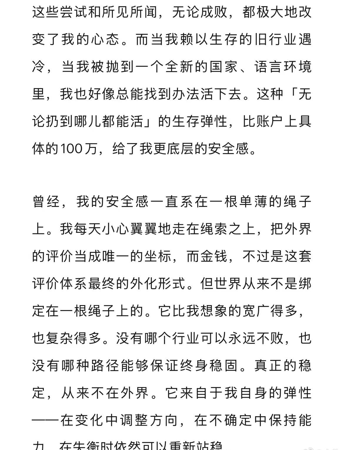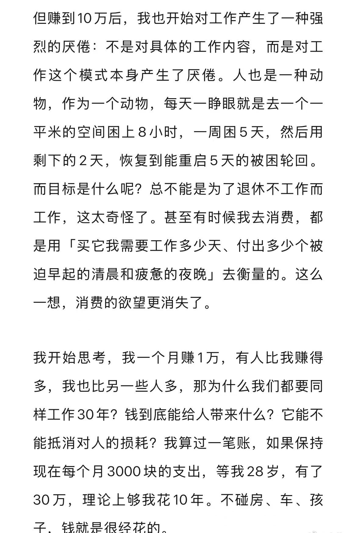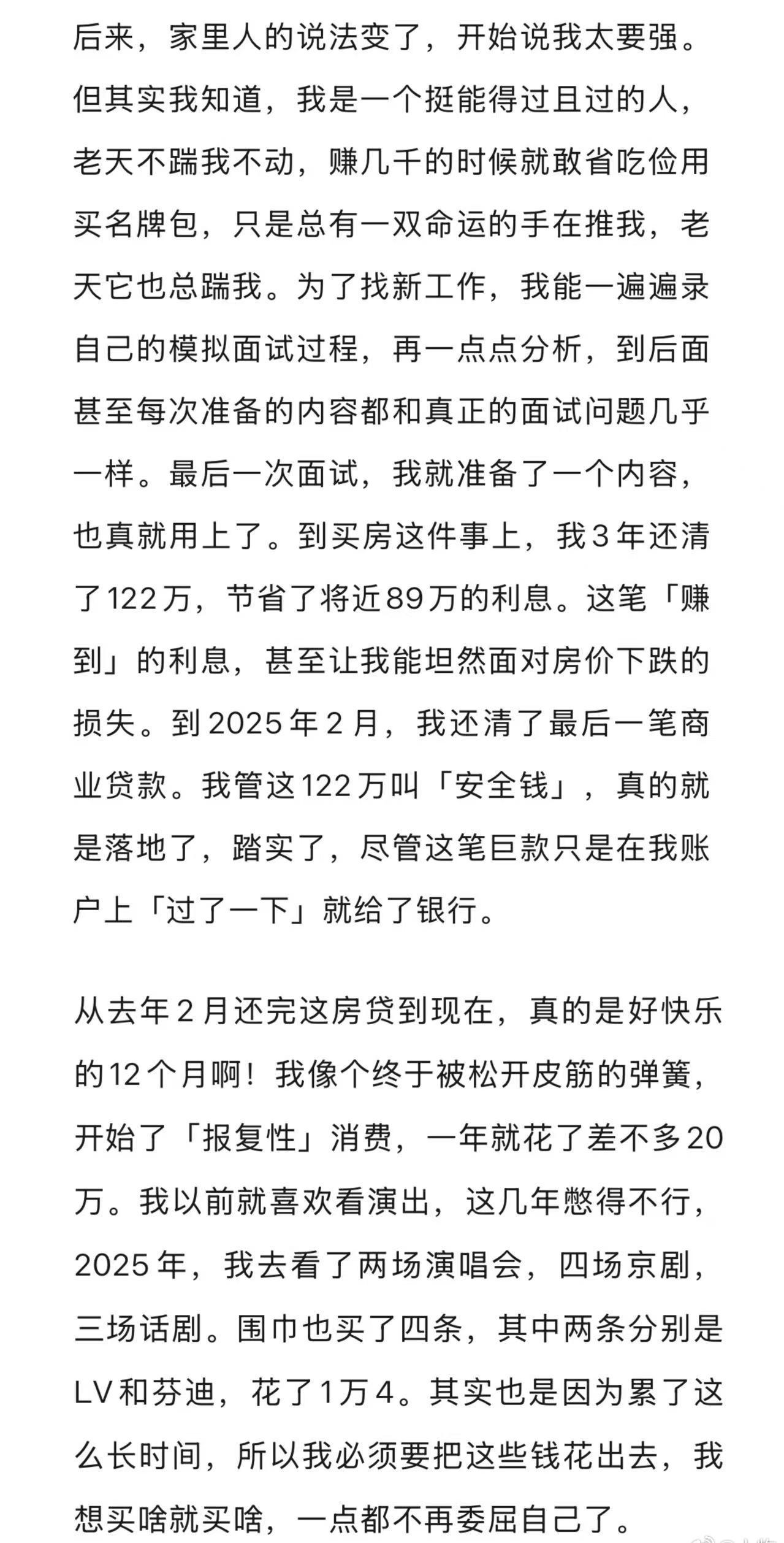 关于「安全钱」,杨卬阳的想法是赚够一百万。但会不会变,他不知道。他唯一确定的,就是自己一定会休息,因为这是他自己赚来的自由。 猫小宝感慨人生真的很神奇。年轻时,她可以省吃俭用三个月,就为买一个两万的包,那是内心需要外在的「重物」来压舱。现在,花3年赚够百万房贷后,她背帆布袋,也能坦然出门了。 Candy依旧需要钱,但它不再是 「价值的标尺」,而是支持自己「自由选择的工具」。她认为,当你能看到并相信,人生有很多条路可以走时,安全感才会真正从内心生长出来。 或许,根本就没有一个确切的数字能带来绝对的安全。安全可能是一种状态,是你对生活的掌控力、对风险的缓冲能力、以及内心能够自我平静的力量三者达到的微妙平衡。问题就在于,很多欲望并非凭空而生,它是被现实推着走的。也许从这个层面上讲,钱永远追不上人欲望增长的速度,也填不满人内心因不确定性而产生的裂缝。