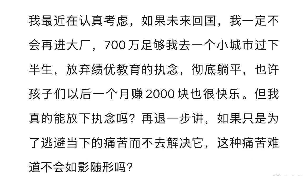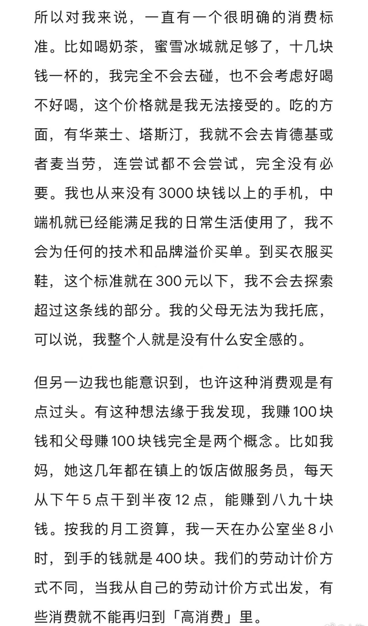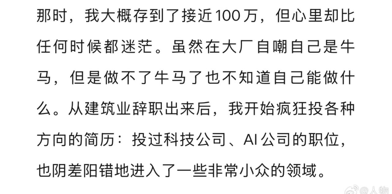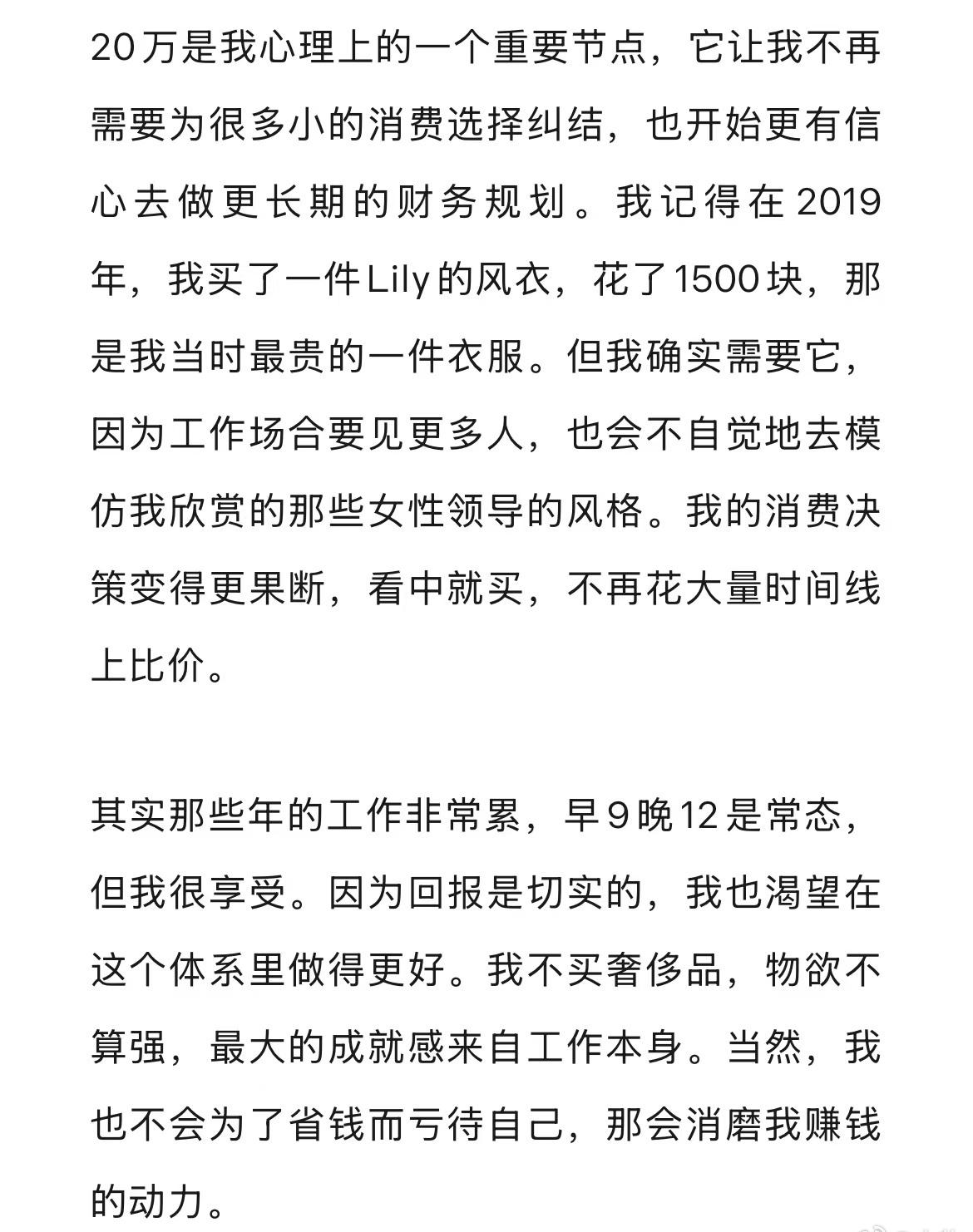 关于「安全钱」,杨卬阳的想法是赚够一百万。但会不会变,他不知道。他唯一确定的,就是自己一定会休息,因为这是他自己赚来的自由。 猫小宝感慨人生真的很神奇。年轻时,她可以省吃俭用三个月,就为买一个两万的包,那是内心需要外在的「重物」来压舱。现在,花3年赚够百万房贷后,她背帆布袋,也能坦然出门了。 Candy依旧需要钱,但它不再是 「价值的标尺」,而是支持自己「自由选择的工具」。她认为,当你能看到并相信,人生有很多条路可以走时,安全感才会真正从内心生长出来。 或许,根本就没有一个确切的数字能带来绝对的安全。安全可能是一种状态,是你对生活的掌控力、对风险的缓冲能力、以及内心能够自我平静的力量三者达到的微妙平衡。问题就在于,很多欲望并非凭空而生,它是被现实推着走的。也许从这个层面上讲,钱永远追不上人欲望增长的速度,也填不满人内心因不确定性而产生的裂缝。