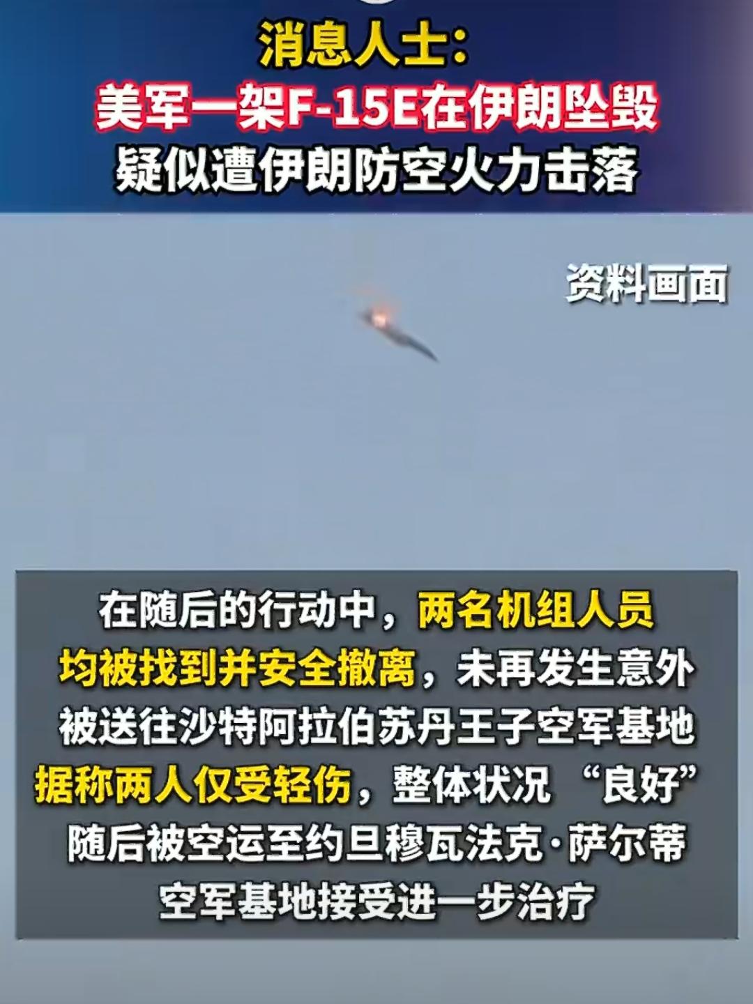 网上已经爆出了视频,以色列媒体也证实这这则消息。据说这架F-15战机在伊朗西南部执行打击任务时,被伊朗防空导弹系统击落。 如果此事为真,那说明伊朗防空能力依然在线,只要有防空能力,美以联军就不会「放开手脚」 。唯一不好的消息就是伊朗没有抓住飞行员,美国战斗搜救部队救出了飞行员和武器操作员。 之前科威特击毁的美军战机,很大可能是被友军误伤。这次坠毁,肯定是被伊朗导弹打下来的!