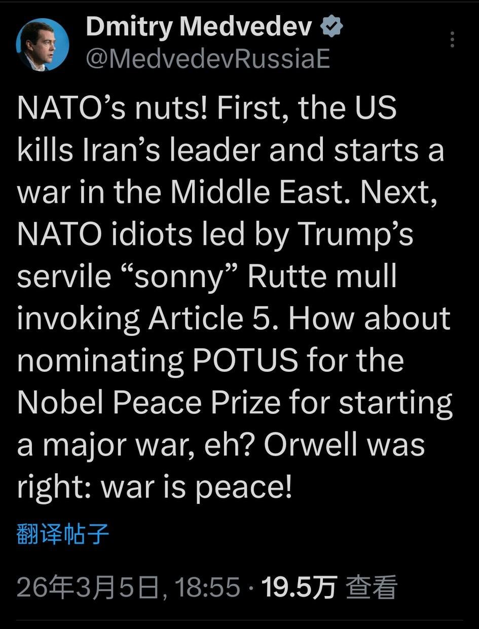 新闻快讯——德米特里·梅德韦杰夫在社交媒体发文: 北约疯了!先是美国杀掉伊朗领导人,在中东挑起战争。接下来,由特朗普那唯命是从的“乖儿子”吕特(Rutte)领导的北约蠢货们,还在考虑启动第五条款。要不,咱们提名这位美国总统(POTUS)因为发动了一场大战而获得诺贝尔和平奖?哈哈,奥威尔说得对:战争即和平! 消息来源:梅德韦杰夫社交媒体发文(2026.03.05)