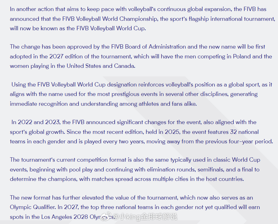 新赛制进一步提升了比赛的价值,现在它还作为奥运会预选赛。在2027年,每个性别尚未获得资格的前3 支国家队将获得洛杉矶2028年奥运会的参赛资格。中国女排世界排坛资讯