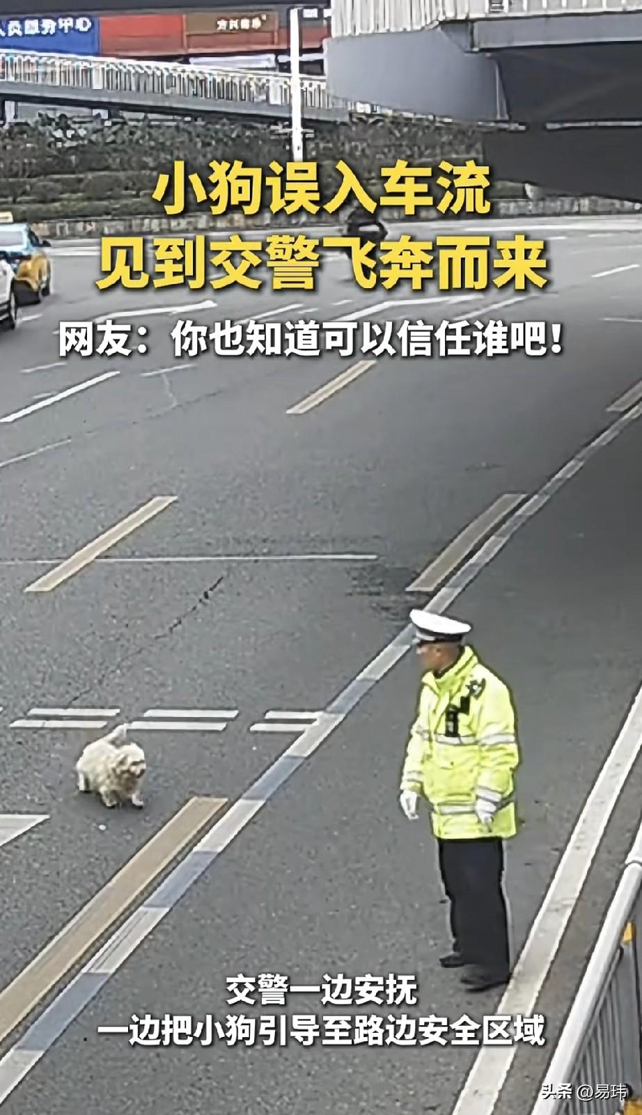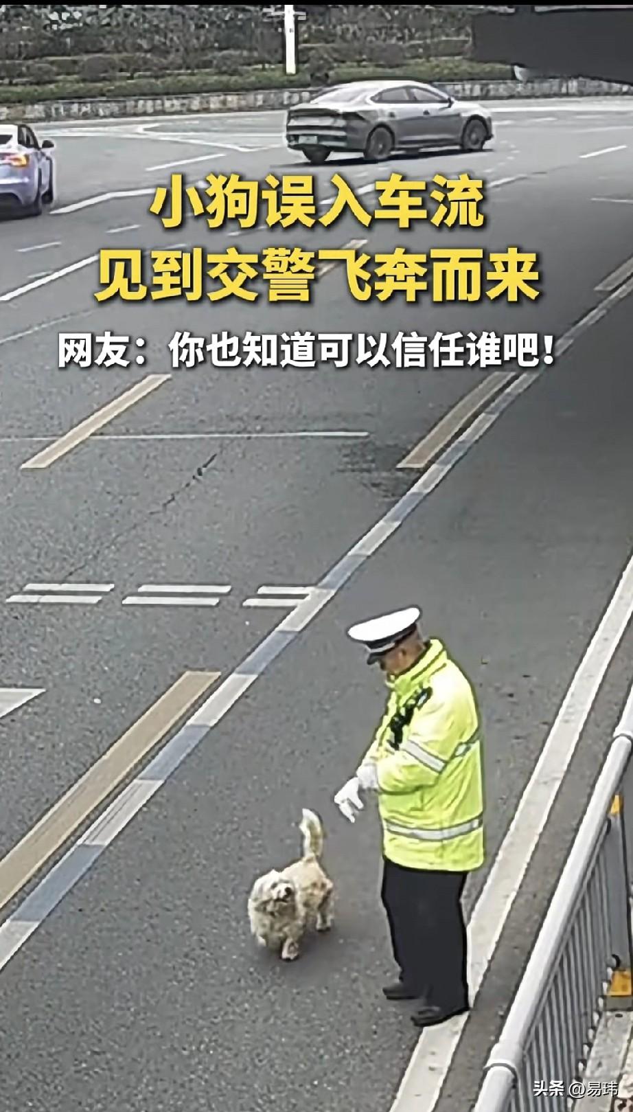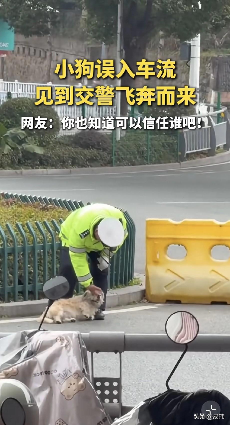 泪目了!这天一位帽子叔叔正在执勤,突然一只误入车流的流浪狗朝他飞奔而来,帽子叔叔见状赶紧一边安抚一边引导到路边安全位置。 这只聪明的狗狗真的太懂了,它居然知道可以信任谁,否则在这车流里,是非常危险的,毕竟每年在马路上丧命的猫猫狗狗不计其数。帽子叔叔温柔的操作,也让狗狗安心,真的是最可爱的人帮助了这只最聪明的小狗!为帽子叔叔点赞!