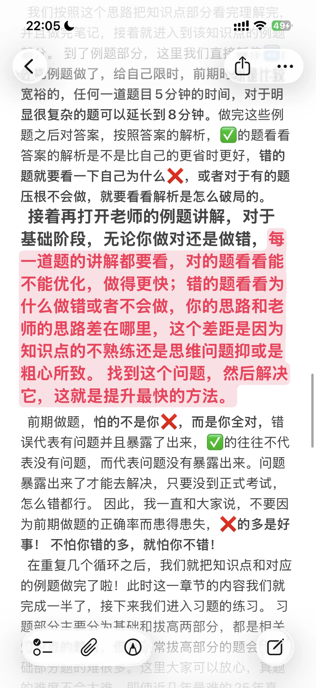7️⃣前期题目无论✅❌都要听讲解,✅的听优化思路,❌的找思路差异看自己为什么做不出来再返工加强。
