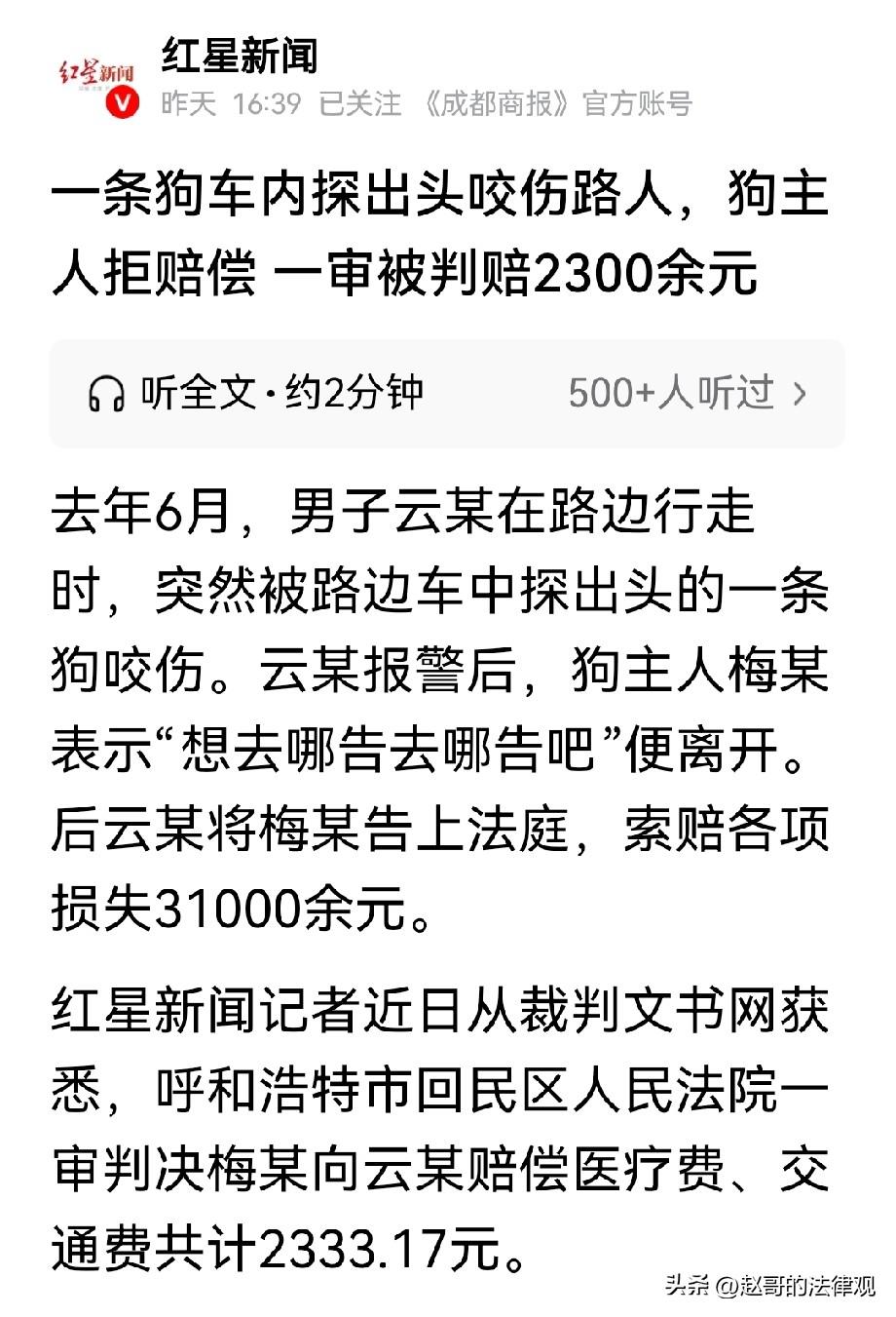 内蒙古呼和浩特,男子外出,好好的走在路边,路过一辆车时,车里的一条狗探出头,一口咬住他的胳膊,怎么都不撒口。男子吓得差点丢了半条命,赶紧报了警,可狗主人扔下一句:要钱一分没有,爱告谁告谁去,开车跑了,连个联系方式都没留下。男子怒将狗主人告上法庭,索赔31000余元,法院判决结果,令人意外! 2025年6月的那天,云某走在路上去办事。 路上人并不多,他尽量走在人行路的树下,了就在他路过靠边停着的一辆轿车时 那辆车的车窗开着,毫无征兆的,里面一条狗突然把头探出来,对着他的胳膊就是一口。 狗咬住了他的胳膊不撒嘴,使劲甩脑袋、拖着拽,云某当时整个人都蒙了,疼得直抽冷气。 云某根本没防备,当时就吓得差点丢了半条命。 幸亏狗主人过来把狗拉开,伤口虽不致命,他连疼带吓,当时心跳得厉害,后背全是冷汗。 云某打小就怕狗,平时只要见了狗的影子都会腿发软,躲得远远的。 这次冷不丁的被狗突然袭击,咬了这么一口,那情形着实可怜。 按理说,自家狗咬了人,主人道个歉、赔个医药费,是人之常情。 可狗主人梅某的态度,完全出乎云某的意料。 他不但没有半句道歉,反而直接说“要钱没有,爱上哪告去哪告”! 连个联系方式都没留,一脚油门开车跑了,把云某一个人晾在那儿。 云某气得够呛,狗咬了人,狗不懂人事,主人也不会说句人话么? 云某站在路边,气得浑身发抖,这狗主人明明就是欺负人! 他忍着疼痛报警求助,又赶紧去跑去医院处理了伤口。 医生经过检查,处理好后又开了5针狂犬疫苗,光疫苗就花了1500多元。 这5针还不是一次打完,而是隔开日期打的。 再加上其他诊疗费,和来回打车钱,加起来是一笔不小的开支。 最可恨的是,梅某这种我行我素的狂妄态度。 他胳膊上的伤还疼着,一会儿半会儿也好不了,总不能就这么算了。 云某白白被咬伤,现在人也跑了,狗也跑了。 他不得不走法律程序,将梅某起诉到法庭,索赔包括医疗费在内的,交通费、误工费、以及精神损害抚慰金,共计31000余元。 云某就是想通过法律,给对方一个教训。 到了法庭上,梅某还是不认账,非说云某伤得不重,狗只是轻轻咬了一下,还要求他必须拿出医疗鉴定来证明。 这些,云某当然有,他向法院提供了,医院的诊断证明,和疫苗接种记录。 单据上,所有花费,以及治疗过程,全部都清清楚楚。 这些单据可造不了假。梅某再嘴硬,在证据面前也得认。 法院经过审理后认为,梅某作为狗的主人,把狗关在开着窗户的车里。 既没人在旁边看着,也没采取防护措施,按规定给狗带嘴套。 他这么做,本身就给路人造成了安全隐患。 自家的狗咬了人,主人必须承担侵权责任。 不过赔偿款上,法律有标准,云某虽然精神上受了惊吓,但伤情没到伤残级别,精神损失费就没支持。 最终,一审判决,梅某赔偿云某医疗费、交通费共计2333.17元。 也就是说,梅某需承担实际发生的费用,但云某诉求的精神损失赔偿被驳回了。 这事虽说赔偿的钱不多,但问题很现实。 有些宠物主人,总觉得自家狗不咬人,或者关在车里就没事了,没尽到监管义务。 更糟糕的是出事后的态度,本该互相谅解,却用“你告我去”的姿态逃避责任。 虽然赔了这2000多块钱是医药费,但也给了不负责的宠物主人一个警示。 让她们得明白,别觉得车里头是自己的地盘,其实车窗一摇下来,责任就跟着伸到车外头了。 对咱们普通人来说,云某这种不吃哑巴亏的做法,虽然是挺折腾,但也说明一个道理。 碰到不讲理的人,别忍气吞声,法律虽然不能什么都赔,但该承担的责任,一样也跑不掉。 那么,从法律的角度我们如何认定此事呢? 依据《民法典》第1246条规定:违反管理规定,未对动物采取安全措施造成他人损害的,动物饲养人或者管理人应当承担侵权责任。 本案中,梅某将狗关在开着窗户的车里,既未在旁边看管,也未给狗戴嘴套。 违反了动物饲养的安全管理规定,给路人造成了安全隐患。 云某正常行走,路过车辆时被狗咬伤,并非故意招惹狗。 因此梅某应承担侵权责任。 法院判决梅某赔偿云某医疗费、交通费等实际发生的费用,是合理合法的。 也是让那些养狗的人,不能只养不管,还得保障公众安全。 对此你怎么看? 关注@赵哥的法律观,明辨是非不上当。