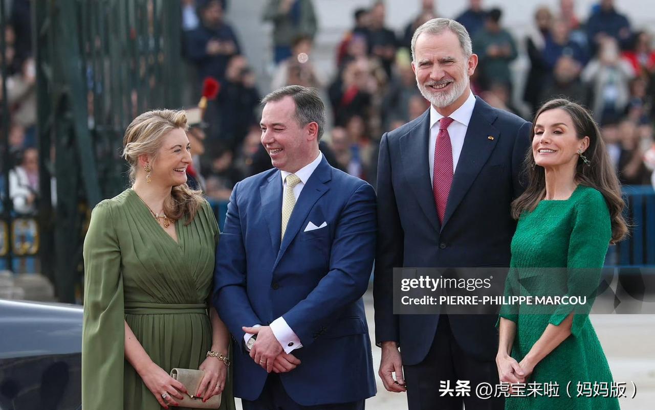 纪尧姆大公夫妇访问西班牙了!斯蒂芬妮的青绿色披风连体裤竟然佩戴了黄色水晶,真不错!精致的发型!当然,王后也不错,旧款绿色连衣裙依然精致,哈哈披发就很随性!