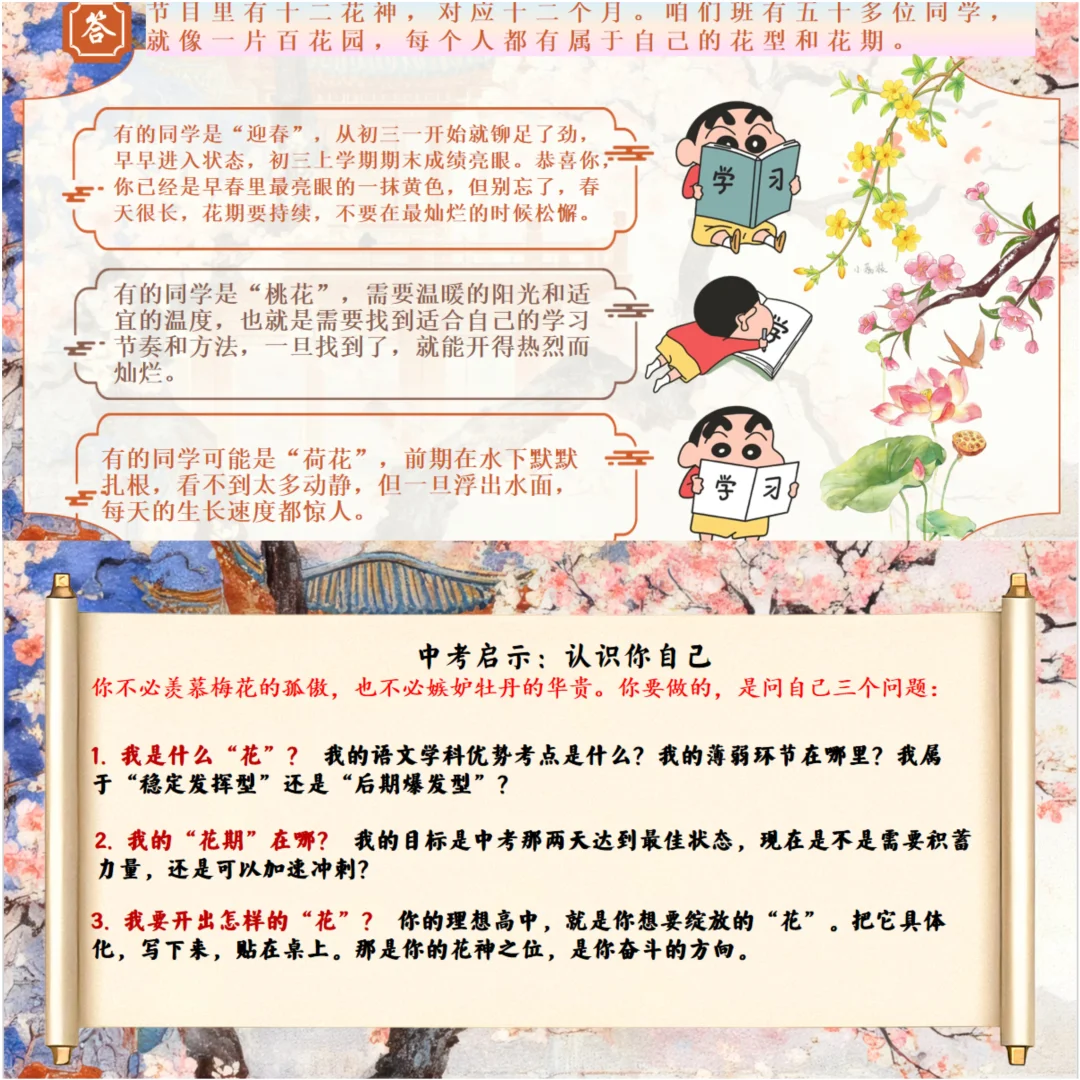 看春晚时最喜欢的节目是《贺花神》,那个时候就萌发念头一定要做相关主题的开学第一课。明天就正式上课了,这学期备考中考了有压力会焦虑,在教育的花园里,有的开花早,有的需要更长的时间,有的长成参天大树,有的开出遍地小花,我们能做的,就是给足阳光、水分和土壤,然后静静地等待,等待他们,按照自己的节奏长大,我们只是种花人。