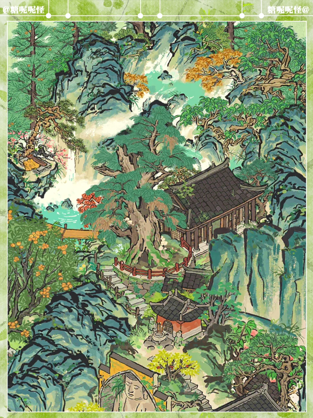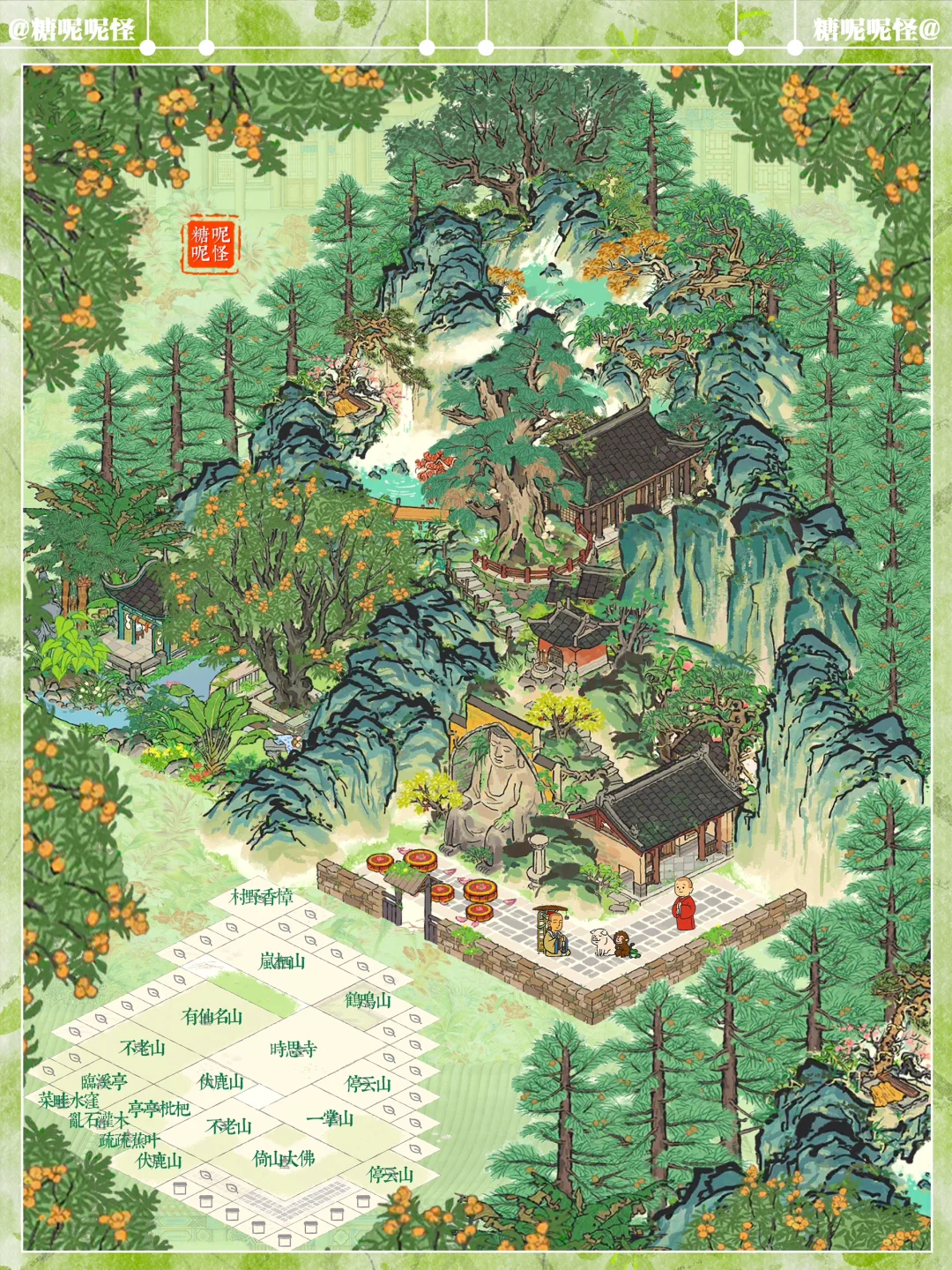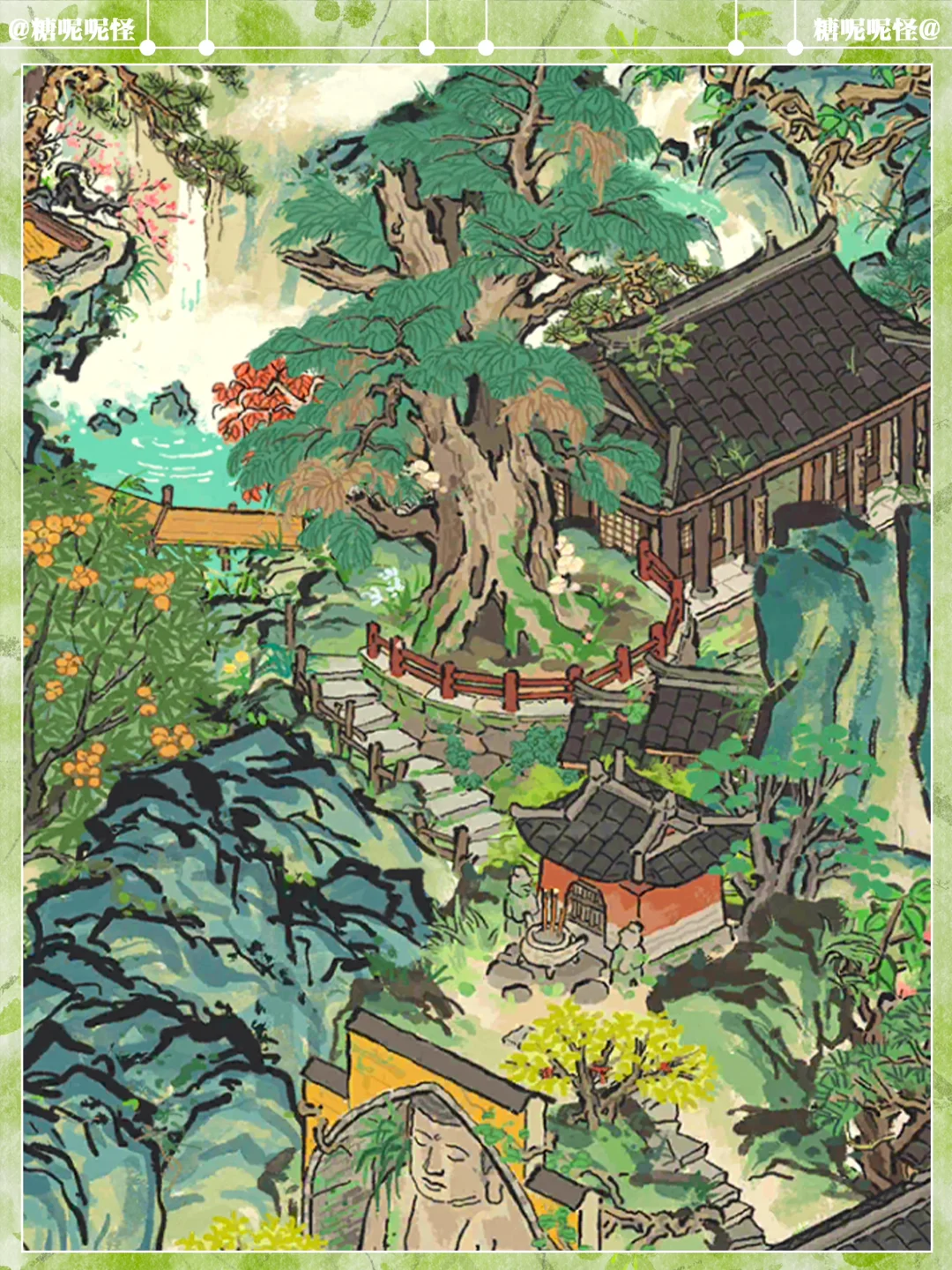 建筑:倚岩大佛|时思寺|停云山那|有仙名山|村野香樟|鹤鸣山|岚栖山|临溪亭|菜畦水洼|乱石灌木|伏鹿山|疏疏蕉叶|伏鹿山