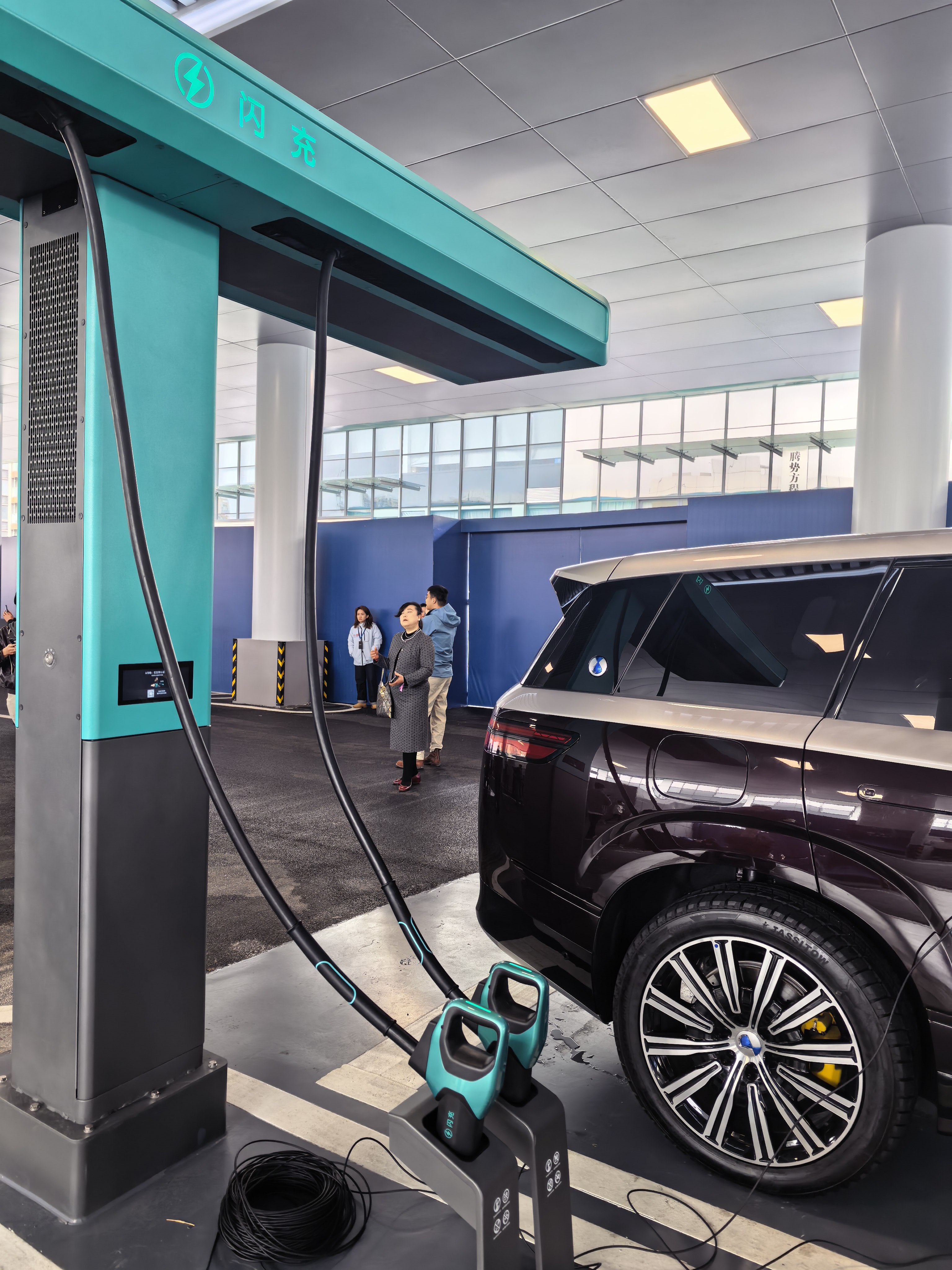 在现场让我更惊喜的是T型闪充桩的设计:枪线轻到我们女生单手就能拎起,再也不用两只手又拉又拽,而且即插即充,拔枪走人,像之前在外充电扫码充值半天的尴尬再也没有了!