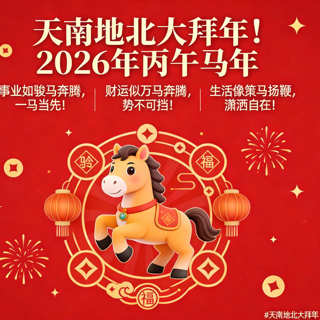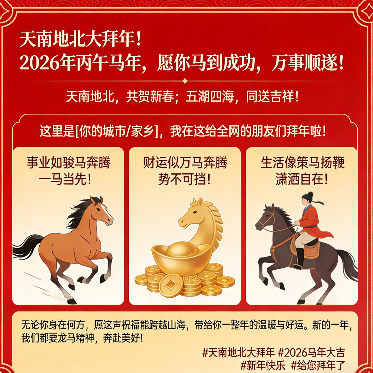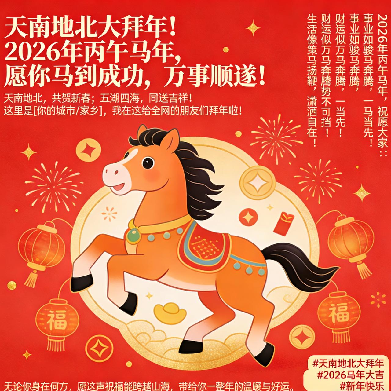 🧨 天南地北,共贺新春;五湖四海,同送吉祥! 这里是[你的城市/家乡],我在这给全网的朋友们拜年啦! 2026丙午马年,祝愿大家: 🐎 事业如骏马奔腾,一马当先! 💰 财运似万马奔腾,势不可挡! 🏠 生活像策马扬鞭,潇洒自在! 无论你身在何方,愿这声祝福能跨越山海,带给你一整年的温暖与好运。 新的一年,我们都要龙马精神,奔赴美好! 天南地北大拜年 2026马年大吉 新年快乐