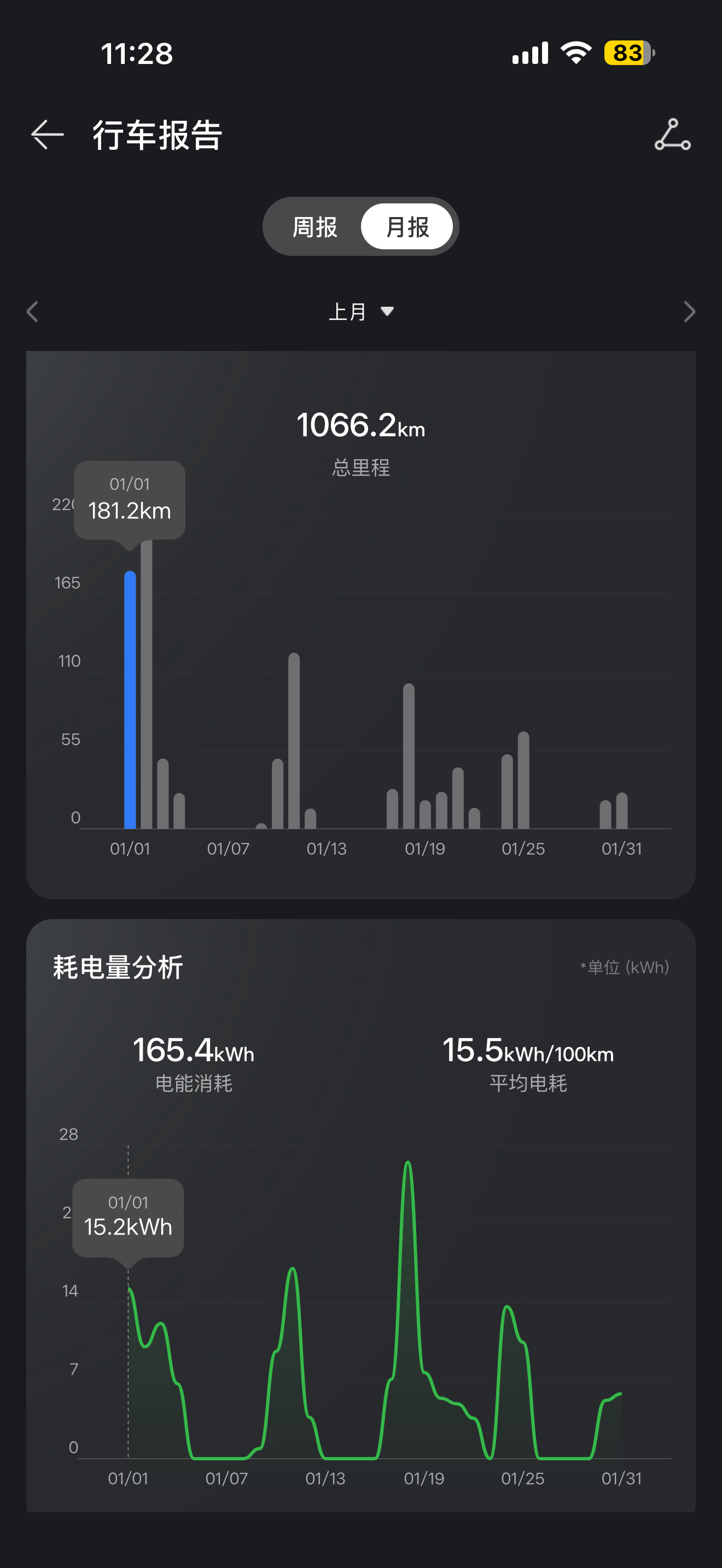 上个月跑了1066.2公里,平均电耗15.5kWh/100km,油耗4.3L/100km。