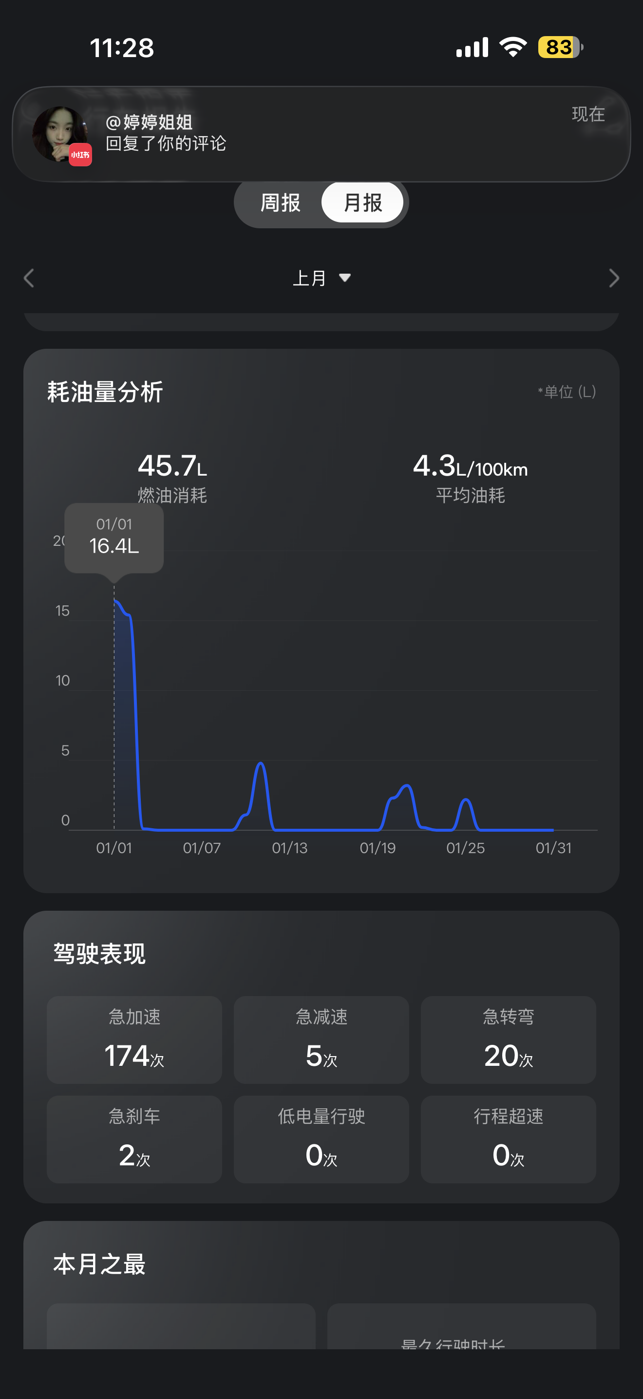 • 驾驶表现里急加速174次,不是我喜欢猛踩,是有时候超车或者跟车不得不踩,这个车动力响应确实快,但也容易让人忍不住踩深。