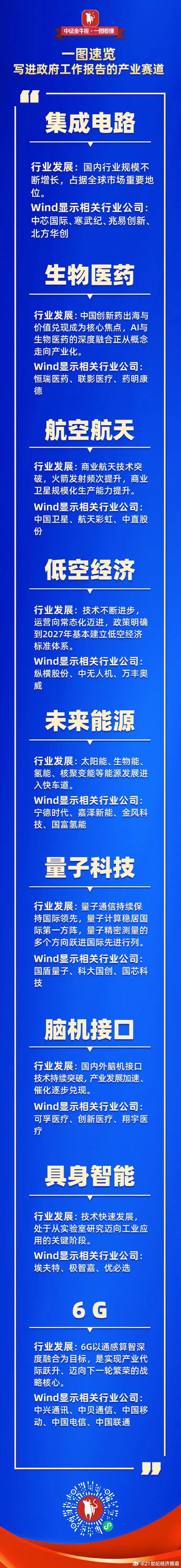 2026政府工作报告 → 对股市的影响 1. 整体市场:主打稳增长,政策托底 GDP 4.5%–5%、财政大发力、赤字 4%、特别国债+专项债一起上 2. 投资和国债多,利好大盘股 特别国债 1.3 万亿 + 地方专项债 4.4 万亿 + 中央投资总支出破 30 万亿 股市结论:资金面很宽松,利好基建、建材、工程机械、公用事业这些“吃财政饭”的板块。 3. 继续促消费,汽车、家电、家居直接受益 旅游、酒店、餐饮、零售今年会被反复炒 2500 亿特别国债:家电、汽车以旧换新 1000 亿补贴消费 + 鼓励旅游 4. 新科技、新产业 = 未来主线,科技成长是未来主线。 重点:集成电路、航空航天、生物医药、低空经济、量子科技、6G、具身智能等,首提未来能源、脑机接口。 5. 民生兜底,医保补助提高、养老金提高,利好医疗和养老。医药、创新药、医疗器械、养老方向有政策底,跌多了会反弹。 一句话总结今年股市影响:稳字当头,资金充足,基建工程/公共事业等政策托底,消费和科技/能源是主线,存在结构性机会。