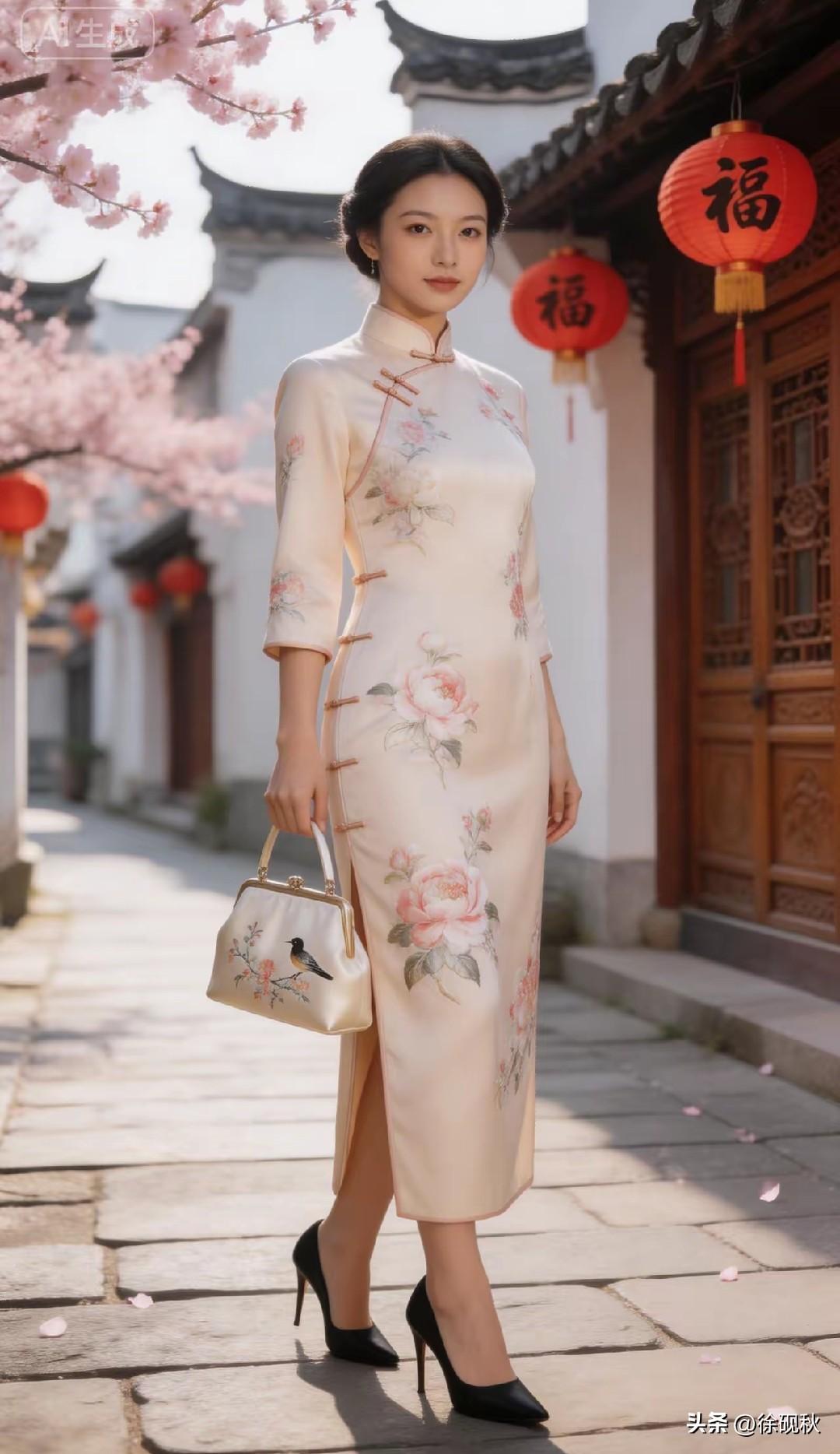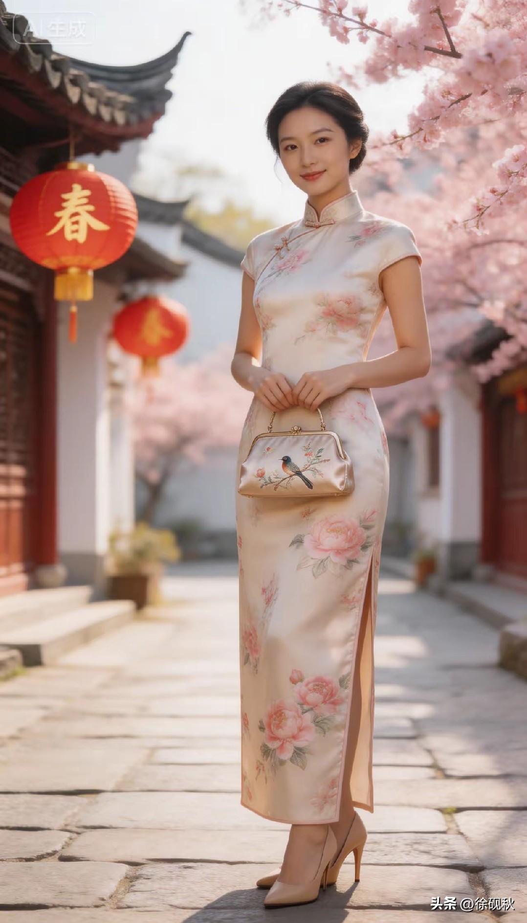 旗袍雅致衬娇容, 白底鲜花显风情。 旗袍雅韵,喜迎新春。 百年传承,推陈出新。 中年女性,光彩照人。 贴身裁剪,凸显风情。 笑艳如花,千般妩媚。