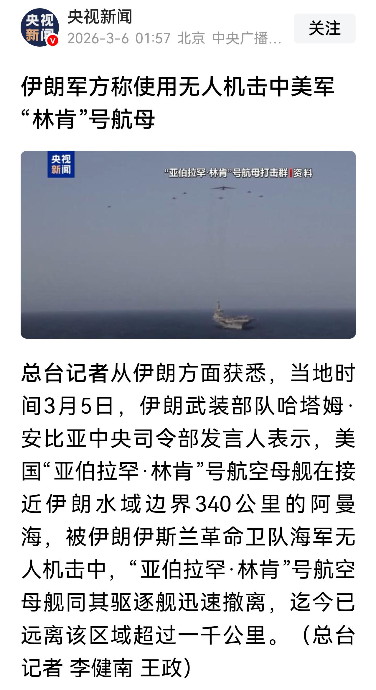 尽管无人机给航母造成的损伤不大,但伊朗就是打了林肯号航母。林肯号受损程度除了美军谁也说不准。但结果摆在那,林肯号迅速撤离,一千公里以外。如果没打中,如果不害怕,它撤什么?对吧。