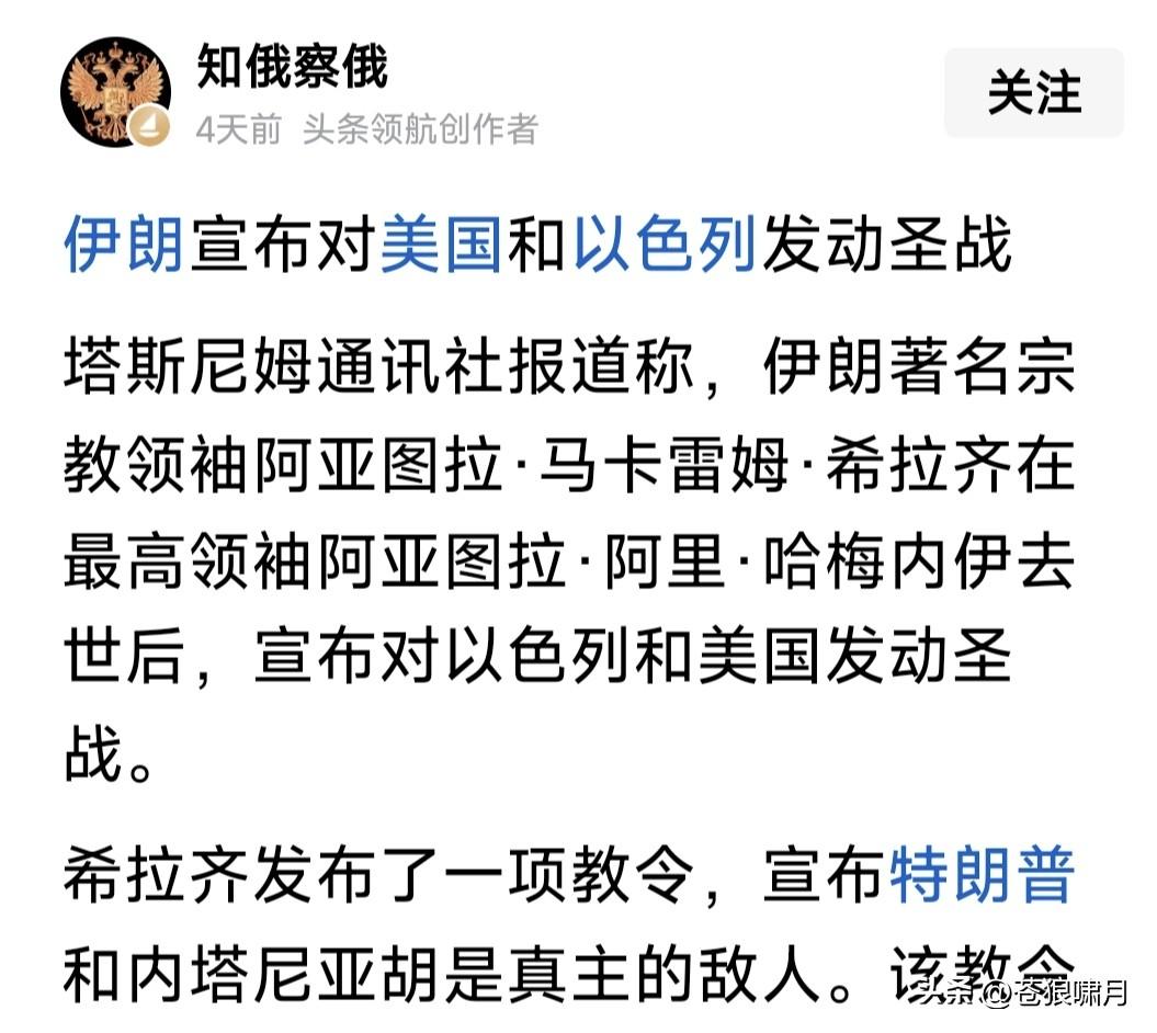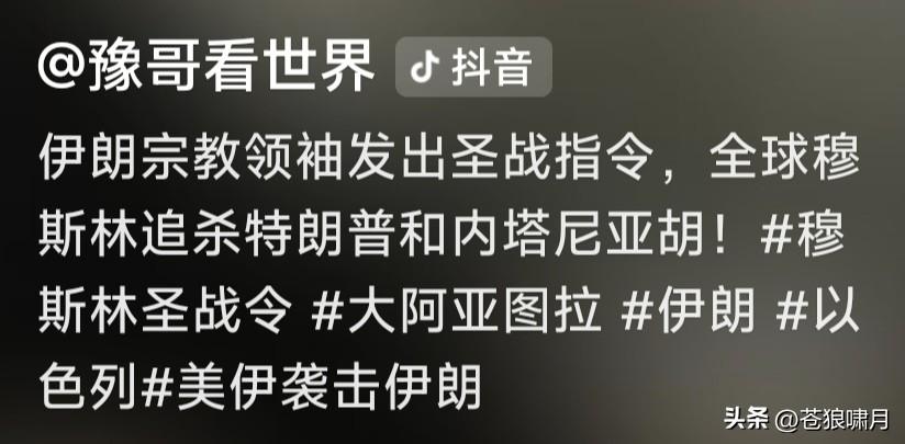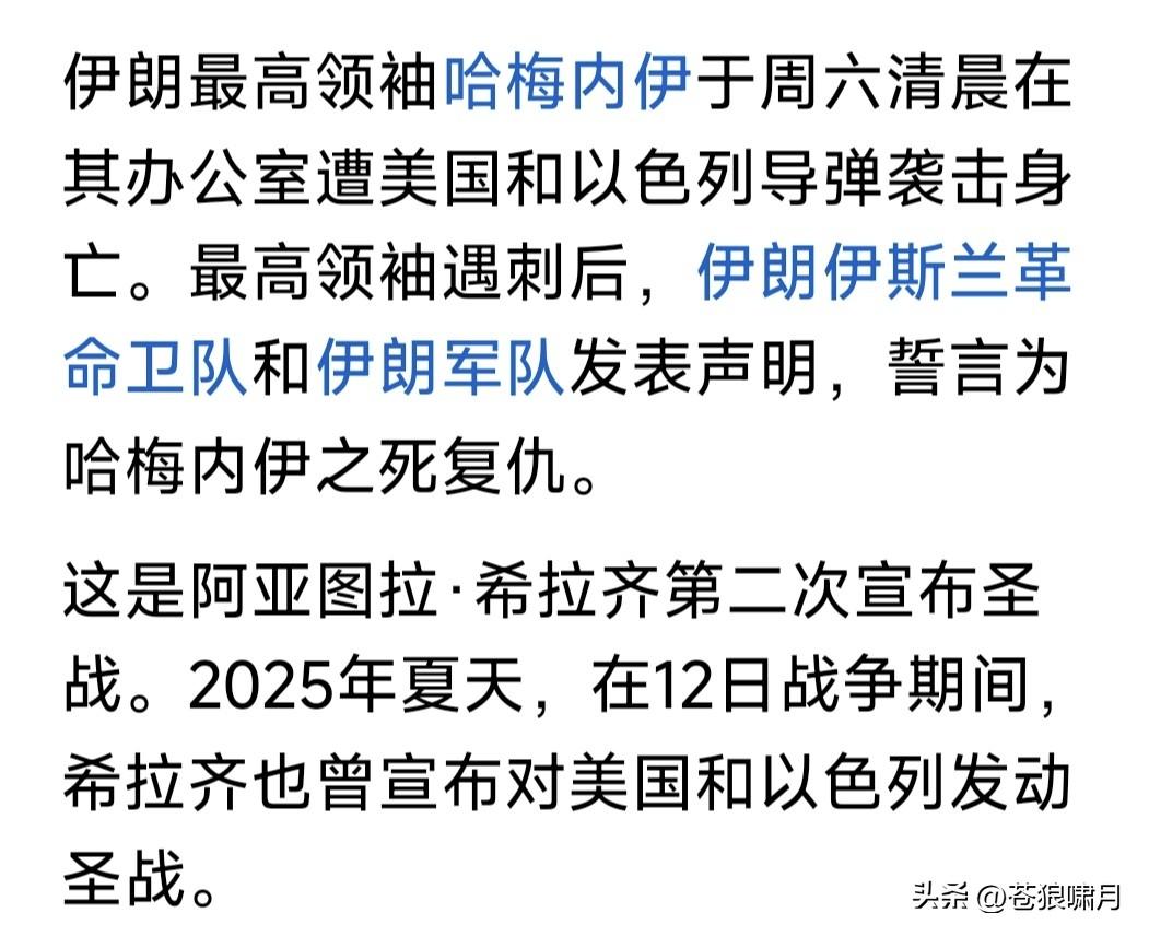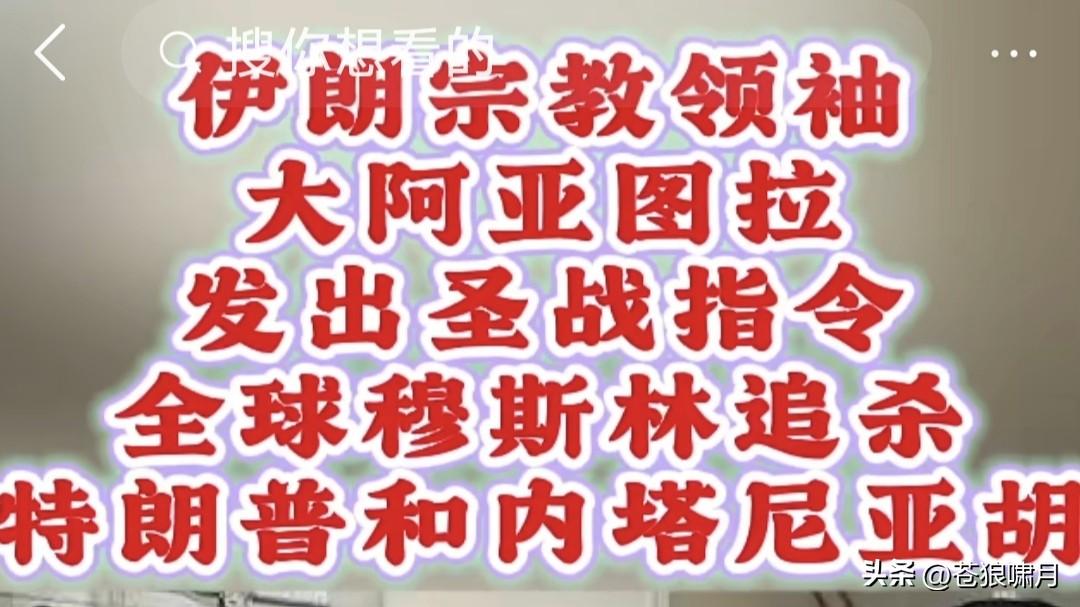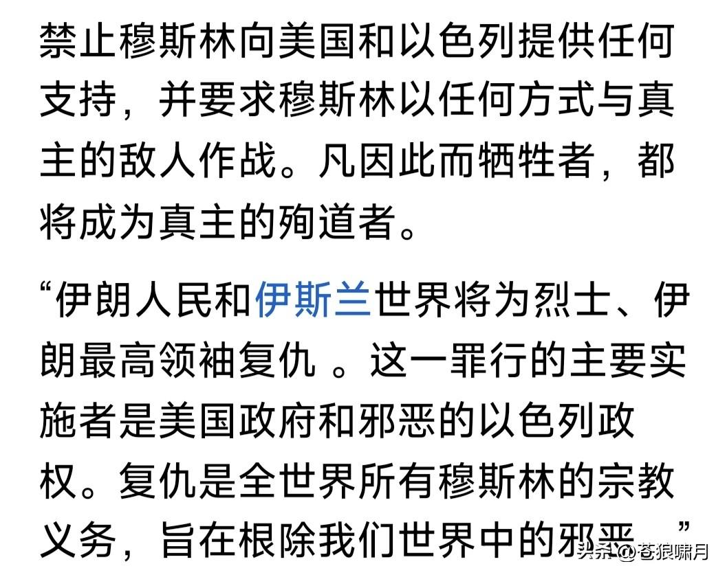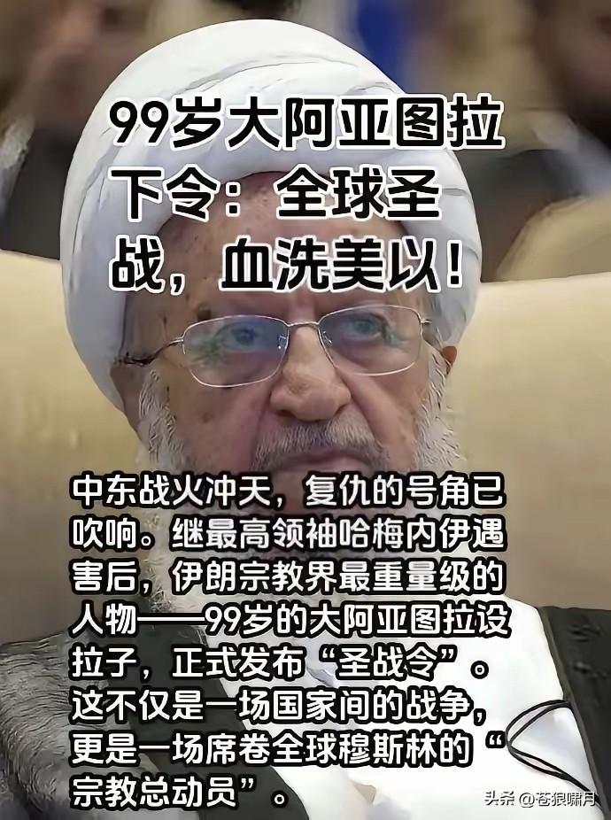 伊朗99岁宗教领袖,大阿亚图拉发出“圣战令”!宣布对美国和以色列发动圣战,号召全世界所有伊斯兰人,行动起来追杀特朗普和内塔尼亚胡! 这不仅是一场“国家间的战争”,而是全球穆斯林宗教总动员!特朗普和尼亚胡是真主的敌人。穆斯林将以任何方式,同他们作战,牺牲者即殉道者! 伊朗人民和伊斯兰世界,将为伊朗最高领袖哈梅内伊于烈士复仇!这是全球所有穆斯林的责任和义务,我们的目标,是根除我们这个世界中的邪恶! 大阿亚图拉在穆斯林宗教中,是什么地位?应该比哈梅内伊还高吧?因为哈梅只是伊朗“最高领袖”,而“大阿亚图拉”则是全球穆斯林的精神领袖啊! 苍狼不知道,在当今世界伊斯兰教中,大阿亚图拉还有多大号召力?可能在什叶派中,号召力比较大?但在逊尼派与移民美欧的教民中,就逊色了? 另外就是怎么复仇?现代战争不是拼人数,而是高科技武器比拼,让众多手握土枪大刀的教众,对着手拿先进武器的现代化军队冲锋,无异自杀啊! 还有就是“自相残杀”!去年6月美以对伊朗打击,大阿亚图拉就曾发出过“圣战令”,但川普和尼亚胡并没被追杀,却导致数万伊朗人被捕或被杀! 现在这悲惨一幕,又要再次重演?哈梅内伊与多位高官遇难后,伊朗神权实控人“安全委”秘书拉里贾尼宣称:伊朗绝不会屈服,将坚决反击打败美以! 临时“过渡领导委”主持人,现任总统佩泽希齐扬也坚称:伊朗武装部队已经行动起来,进行全面反击,要让“敌人”感到“绝望”!直到最后离开伊朗! 苍狼不知几位所言,谁真谁假?谁是职位所在不得不这样讲?谁是言不由衷身在曹营心在汉?但有一点能肯定,继续打下去,遭难都是平民百姓啊! …………