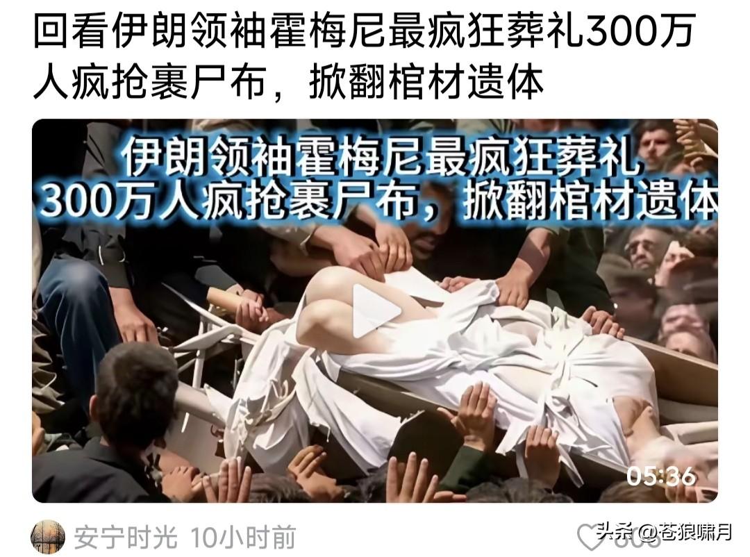 疯狂!网友视频播放霍梅尼国葬现场,场面壮观声势宏大,300万人送别“最高领袖”!让人震撼感动。 谁知下葬时刻,群众竟然控制不住内心情感,争相涌向棺材,挤翻棺盖,抢夺“霍梅尼”身上的“裹尸布”! 现场警察用水龙头喷射,都驱赶不走抢夺的人群!“霍梅尼”遗体被露出。局面失控,只得进行二次下葬! 这样的场面让人无语!不知这些“霍梅尼的崇拜者们”,他们是对“最高领袖”的崇敬?还是一种亵渎呢? 这样的群体,属于文明范畴?还是仍在蒙昧状态?这种状态要不要打破?如果打破,是解放还是侵略呢? …………