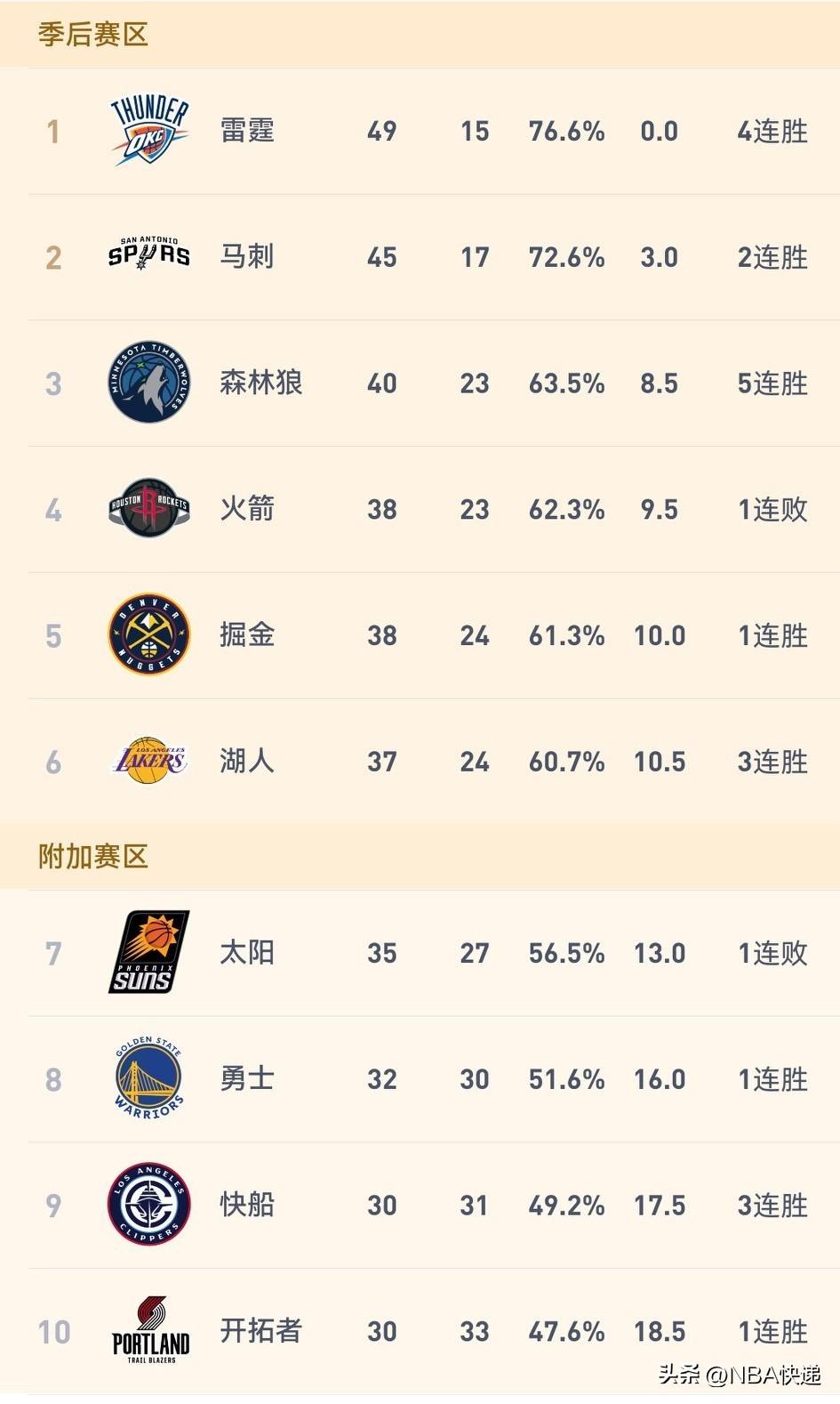 3月6日西部第二至第七名全部出战!湖人输给掘金后排名跌到西部第六。 火箭输球从第三跌到第四,不得不说,勇士一打火箭就来劲,虽然没有库里和巴特勒! 掘金39胜24负继续排名西部第五(与第四名胜场差为0,仅胜率低于火箭)。 太阳惜败公牛,距(脱离附加赛区)湖人还是2个胜场差。 森林狼战胜猛龙,凭借一波五连胜排名升至西部第三。 马刺轻松拿下东部第一活塞,以2个胜场差排名西部第二,赛季还剩约20场比赛,他们仍有机会超越雷霆。