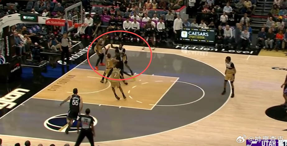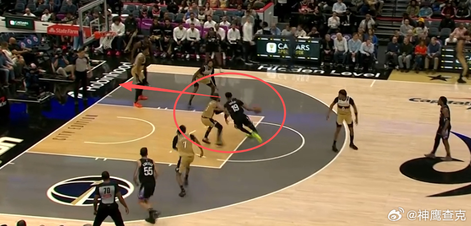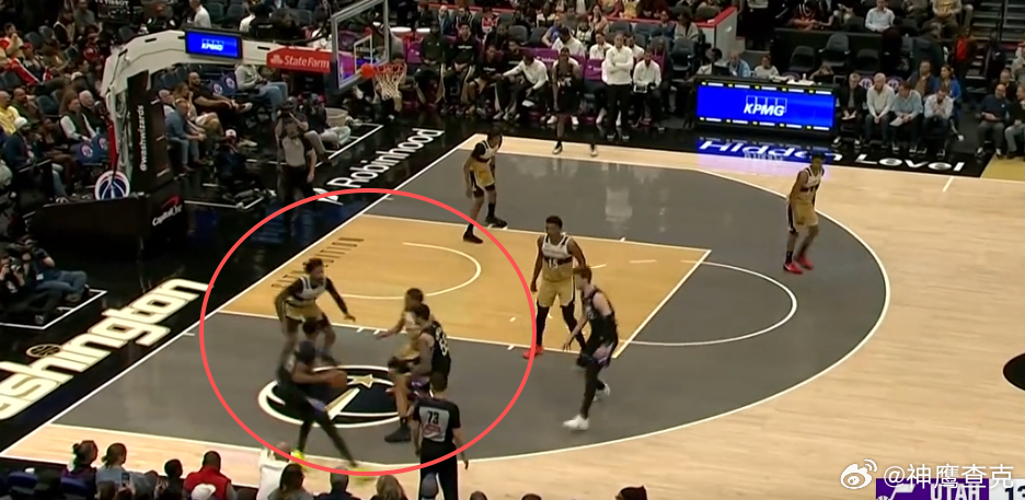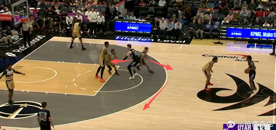 16 17 18科迪右侧底角无球上提手递手接球后,停留在右翼持球发牌。爵士弱侧随即发动无球传切战术配合,贝利无球起手借助康查尔“Pin Down”“Curl”篮下,三分线内一步接球后立即启动突破长驱直入直捣黄龙,杀入篮下后立即起飞双手暴扣将球放入篮筐。