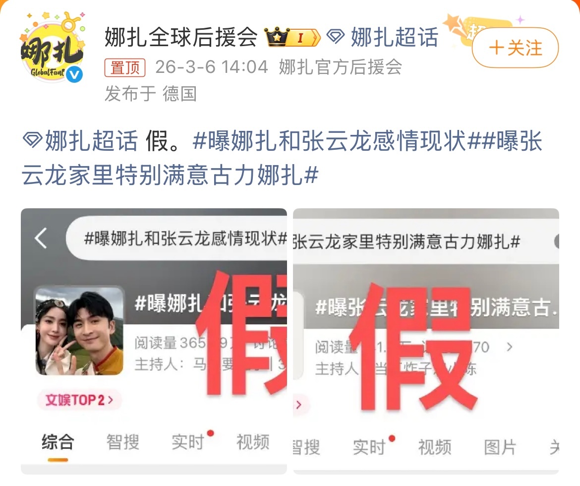 娜扎后援会辟谣感情现状有八卦曝出娜扎张云龙感情现状,称张云龙家里特别满意古力娜扎,对此娜扎全球后援会辟谣:假!还是专注帅哥美女的作品吧!