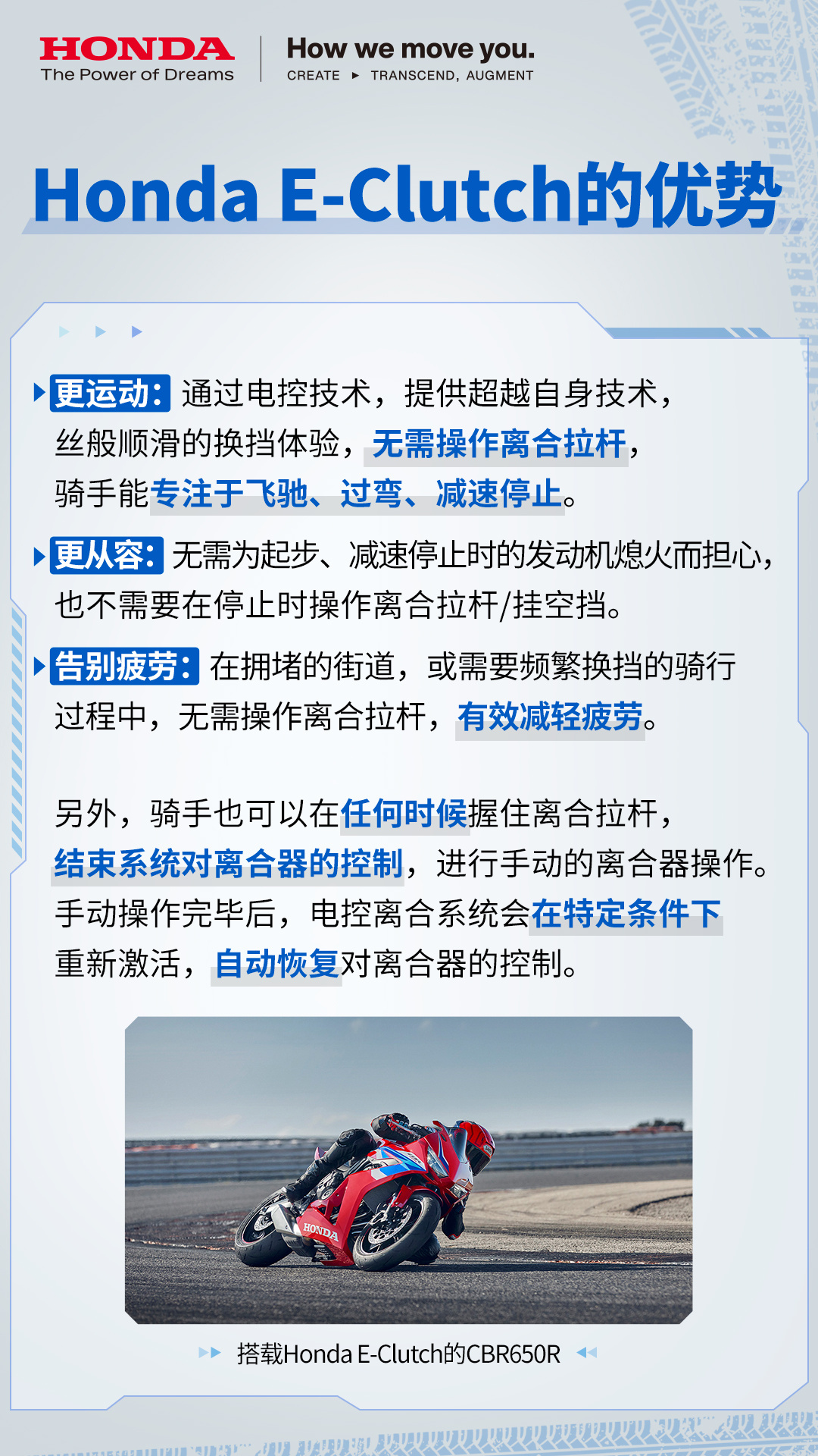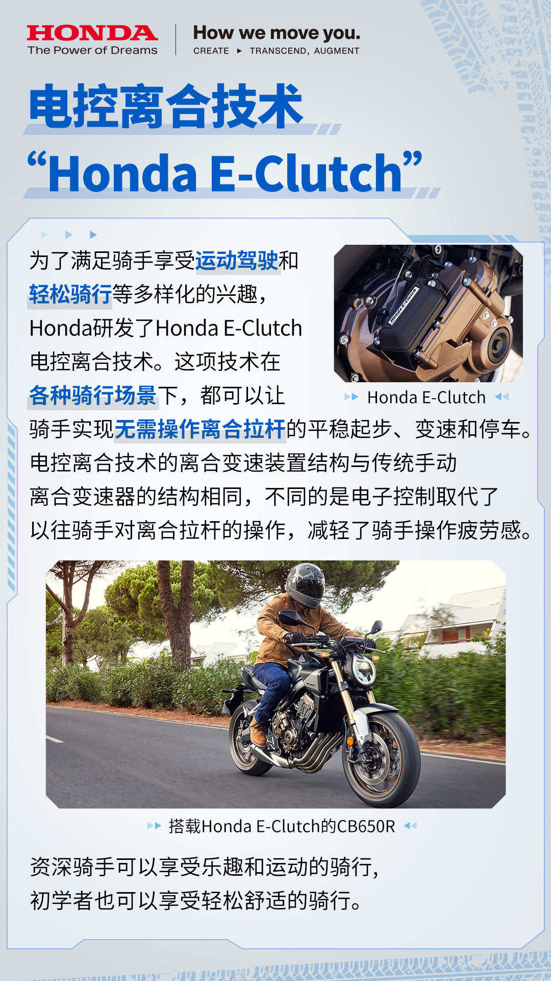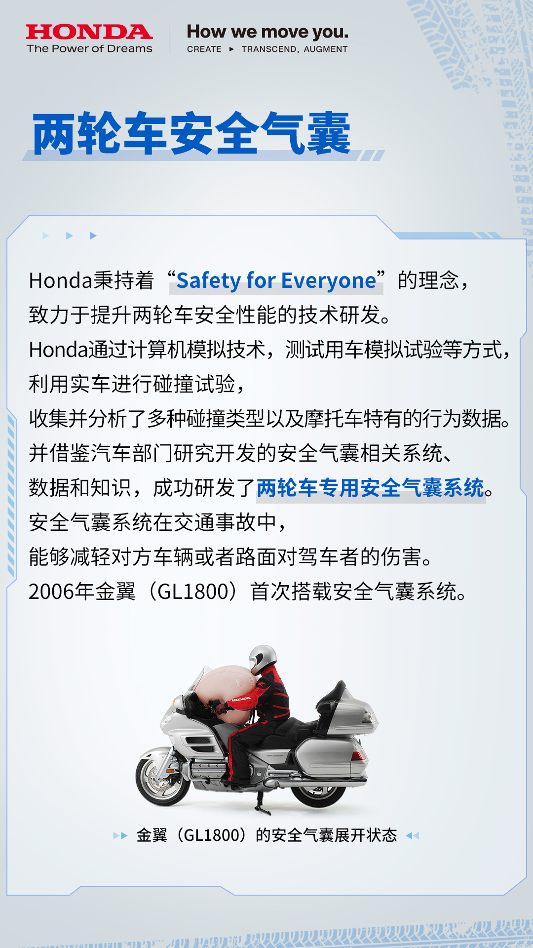 研究摩托车技术这么多年,我愿称本田是摩托车界的“技术流”。一是因为他们对待技术研究的态度,无论是成立专门研发的公司,还是内部的工程师文化,都让人能感受到本田对于技术研究的重视。二是因为本田技术确实引领了摩托车行业的发展,为骑手研发出了更好骑更安心的摩托车。比如今天提到的摩托车用的安全气囊,这个功能为骑士增加了一道防护屏障,降低了骑士受伤风险;而E-Clutch电控离合技术能够让骑士们不必再担心繁复的离合操作,轻松享受骑行乐趣,除此之外还有很多……有兴趣的朋友可以点大图看看这篇文章,了解一下本田在摩托车领域更多技术创新。如果你也感受到本田在摩托车技术上的匠心,也可以点击【网页链接】参与本田发起的骑行给我的答案 有奖征集!说出你对本田技术的印象。