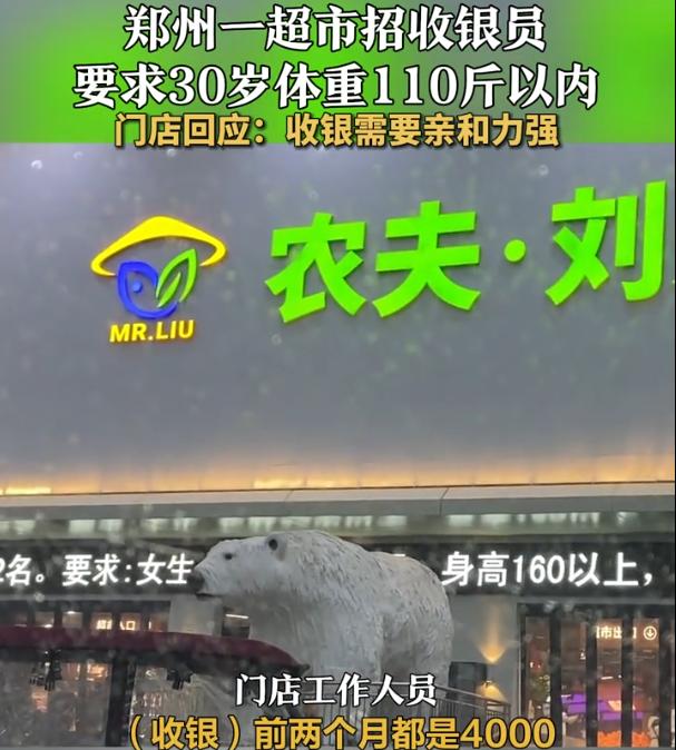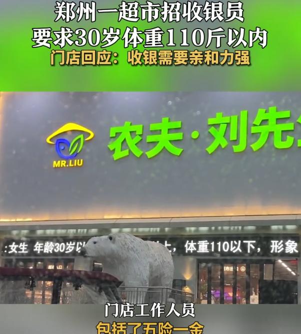 河南郑州,一家超市在大屏幕上招聘收银员,不过上面的要求却引起了不少讨论,不仅要求年龄在30岁以下,就连体重都要求在110斤以内。网友:“这下真的收银都不要我了!” 这则招聘信息被路人拍下来发到网上,评论区一下就炸了。有人说这下连收银员都不要我了,有人问胖一点就不能数钱了吗,还有人调侃说这是招收银还是招模特 门店工作人员回应称,收银岗位确实有一定形象要求,需要亲和力强一点。薪资方面,前两个月都是4000元,有7天试岗期,试岗期工资100元/天,两个月后转正 亲和力跟体重有什么关系?这个问题值得琢磨 超市收银员的工作内容是什么?扫码、收钱、找零、装袋。这些动作跟体重有必然联系吗?显然没有。那为什么要加这条限制? 说实话,把形象和体重划等号本身就是个问题。胖就没有亲和力?瘦就一定讨人喜欢?现实生活里胖乎乎笑眯眯的收银员让人感觉亲切的例子比比皆是 当然,企业有自主用工权,定什么条件是老板的自由。但自由的同时,也得想想这种做法是不是真的合理。把收银员当门面,要求形象好,可以理解。但把形象具体到体重数字,就有点过了 话说回来,找工作本来就是双向选择。超市定这样的条件,自然会吸引愿意接受这个条件的人。接受不了的大不了不去。市场会给出答案,如果这样的招聘真能招到合适的人,说明这套标准在市场里是行得通的;如果招不到或者招到的人留不住,超市自然会调整