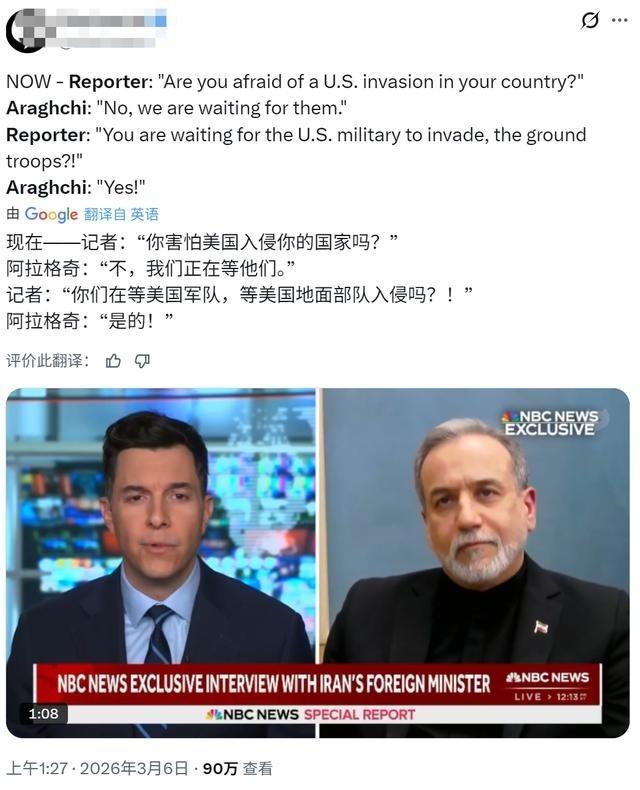 伊朗外长淡定接受美媒采访:伊朗无惧地面战争。 3月5日深夜,伊朗外长 阿拉格希 登上 美国 NBC,全程稳得离谱,还带着一丝若有若无的笑。这个采访的片段在国外社交媒体都在传。 采访发生在美以对伊朗境内行动持续期间。阿拉格希通过视频连线阐述了伊朗对潜在地面入侵的态度。他明确表示伊朗不担心此类行动并且正处于准备迎接的状态。这种表态建立在对自身防御能力的评估之上。 他进一步指出过去与美方的两次对话经历影响了当前立场。每次对话推进到关键阶段时外部攻击就突然发生导致信任完全丧失。伊朗因此决定不再主动寻求谈判渠道。 阿拉格希还说明伊朗军事回应仅针对地区内美方设施和部队不会扩展到美国本土。他提到霍尔木兹海峡和油轮通行目前没有关闭计划但局势恶化时可能纳入考量。伊朗始终保留开放对话的可能性前提是外部停止军事行为。 整个采访聚焦于伊朗对外部压力的整体应对策略。他强调抵抗行动已被视为国家防卫的核心内容。伊朗从去年6月持续12天的对抗中积累了经验当时对方在抵抗后提出停火要求而伊朗并未主动提出类似安排。