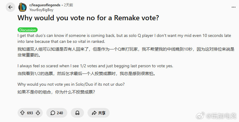 【Reddit热议】外服单排玩家破防!排位碰到有人拒重开,就怕中路晚10秒上线影响局势,看到1/2重开票就急得求最后一人同意,搞不懂非双排的为啥要投反对票啊🤯大家排位遇过拒重开的离谱队友吗?