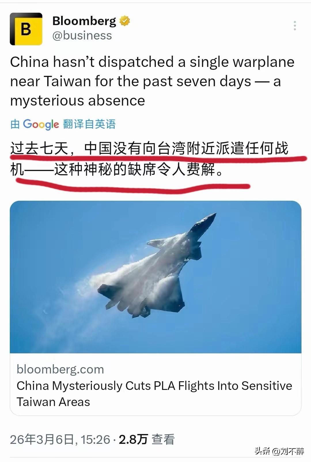彭博社今天(3月6日)报道:“过去七天,中国大陆没有向台湾附近派遣任何战机—这种神秘的缺席令人费解。” @刘不醉 评:近期大陆战机在台海空域的活动变化,是基于整体战略节奏的主动调整,并非所谓的简单“缺席”。 这种战术层面的按兵不动,恰恰体现了解放军对台海局势的绝对掌控—战机是否出动、何时出动,完全由解放军依据形势自主决断。