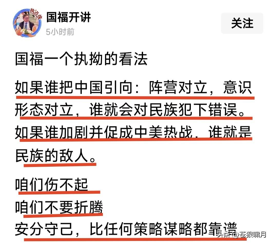 致敬网友“国福”,说出苍狼心里话!如果谁把中国引向:阵营对立,意识形态对立,谁就会对民族犯下错误。 如果谁加剧并促成中美热战,谁就是民族的敌人!咱们伤不起!咱们别折腾!安分守己,比什么谋略都重要! 国福寥寥数语,通俗易懂,简洁明了!却说出一个深刻道理:善为本和为贵。和气生财互斗生乱,古今如此! 不说历史,只说现在。美国是世界最强大国家,身后还聚集北约欧盟G7等一群伙伴,互相争斗有好果子吃? 实话实说,中国拨乱反正改革开放,就是在美欧日韩澳新等发达国家帮助下,经由我们自己努力发展起来的! 相反的例子也有:比如萨达姆卡扎菲,坚持反美斗美,结果都被老美收拾!更有伊朗古巴委内瑞拉,曾与美国交好,经济发展不错。后来与美反目,被美封锁制裁,最后一个个陷入贫穷! 最突出的例子,就是苏俄!苏联时期与美国争霸,最终导致解体。俄继承苏联遗产,依然不把老美放在眼里,在欧洲南美非洲中东与美争霸。发动俄乌战争与美争夺欧洲,后果是什么呢? 有网红战狼不断鼓噪,网络义拳摇旗呐喊:美国害怕中国崛起,处处遏制中国发展,是中国目前最大的敌人! 真是胡说八道!什么叫敌人?美国把反美国家视为敌人,比如伊卡委古伊。我们中国不反美,怎么是敌人呢? 什么是敌人?现在的敌对国家,最明显的标志,就是断绝外交关系,互相之间发生战争。除此之外都非敌人! 中国改革开放,是靠美欧等发达国家支持发展起来的!我们实现生活小康,老美担忧中国超越,开始有意“遏制”,但也不是“敌人”,应是竞争关系! 竞争关系含义,既竞争也合作!政治理念存在分歧,科技经济存在摩擦,但双方经贸互融很深,求同存异合作共赢,对中国持续发展,仍然很重要。 某些网红战狼网络义拳,整天叫嚷反美斗美,是想破坏中美之间的“竞争合作关系”,把老美推向我们的对立面吗?这样的后果是什么?傻子都懂! 其实换谁都一样!假设俄是全球最强大国家,会对世界怎么样?几百年的扩张史已经说明一切。起码对于欧洲以及邻国,绝不会像美国这样“友善”! 说一千道一万,回到原题一句话:目前世界大融合,合作发展是趋势!谁搞国家斗争,必然破坏合作,伤害国家经济,导致人民贫困。不可行啊! …………
