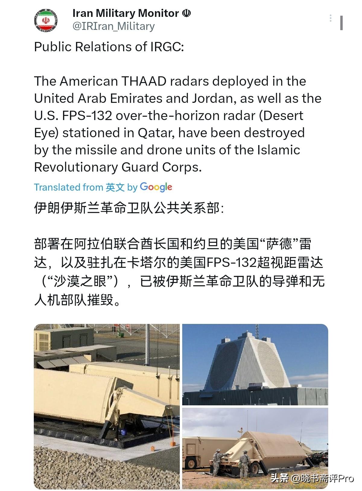 没想到萨德反导系统如此不堪一击!伊朗这是给全世界打了一个样!3月6日,伊朗革命卫队发表声明表示,部署在阿联酋和约旦的美国萨德雷达系统和驻扎在卡塔尔的美国FPS-132超视距雷达(沙漠之眼)被伊斯兰革命卫队的导弹和无人机部队摧毁。很显然,三套雷达系统对伊朗摧毁,这对于美国无疑是重大的打击。 单从成本的角度而言,仅这3套核心雷达美国就损失了高达21亿美元。当然,从军事角度而言,美国的麻烦将非常大。失去这三套反导雷达系统之后, 美国的萨德与爱国者导弹将失去核心引导,美国的高空拦截能力基本算是作废了。面对来袭的伊朗导弹,美国可预警时间将被压缩到以秒为单位,伊朗的导弹突防成功率将大幅度提升。 从萨德导弹的全球部署而言,美国在全球也仅有7套萨德雷达,此次被毁2套,美国短期内难以补充。而更加让美国郁闷的是,随着萨德反导系统神话破灭,各国都会从伊朗的打击案例中找到对付萨德系统的办法,这事实上美国的萨德系统将沦为摆设。而在盟友眼中,他们将越发意识到美国无法保护自己,美国的军事震慑力无疑将大幅度下滑。