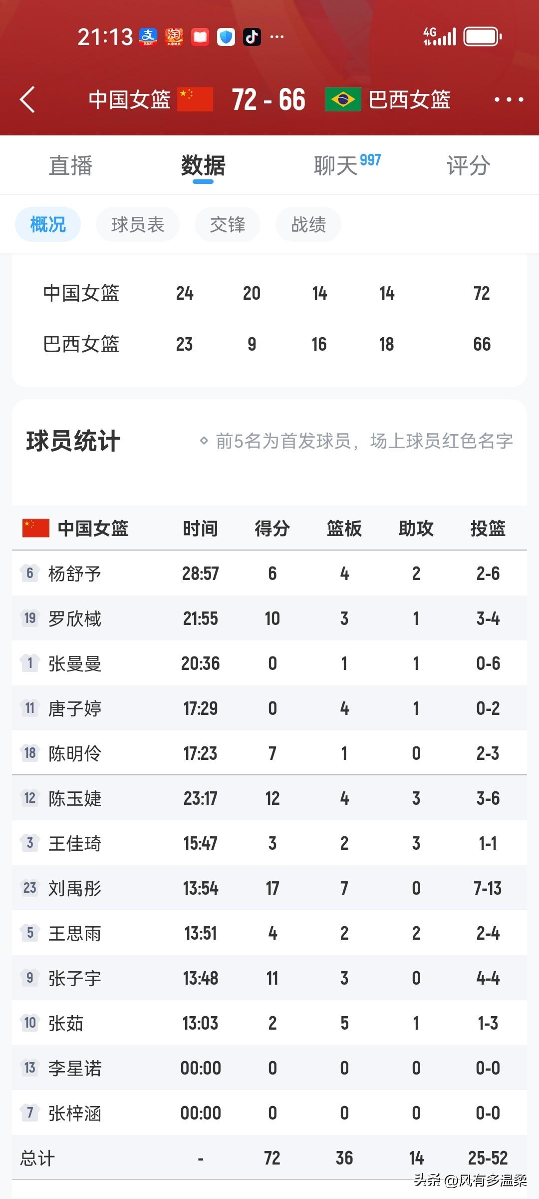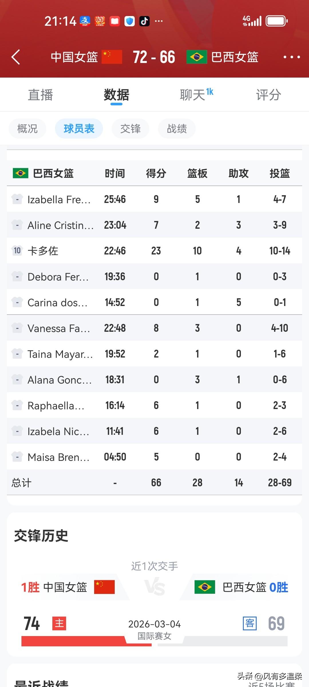长沙中巴女篮热身赛,中国女篮再胜巴西队 积极备战世界杯的中国女篮,今天晚上在长沙同巴西女篮进行了第二场热身赛。整场比赛,中国女篮一直压制着巴西队,尽管巴西队发起一次又一次的冲击,但中国队总能保持比分的领先。但比赛中中国女篮也表现出了失误多的毛病,这在遇到超强队打快速反击和外线投射准时,中国女篮可能会处于劣势。后卫在给张子宇传球时时机把握欠火 候,张子宇接球不稳被断现象严重。巴西队断球反击时张子宇难以回防,来回折返跑消耗巨大,节奏上显得慢半拍。 年轻球员持球冲篮下多次被生生盖下,揭示经验问题。世界杯开赛在即,主教练宫鲁鸣应该慎重考虑以上问题。 本场比赛,大宝贝刘禹彤值得点赞。对抗一流,投篮也不错,多次护框成功,攻防都很有贡献。这些宫导都看在眼里。 接下来,中国女篮还将与捷克女篮进行一场比赛,之后赴武汉参加女篮世界杯。期待女篮在世界杯上的表现,预祝中国女篮取得好成绩!