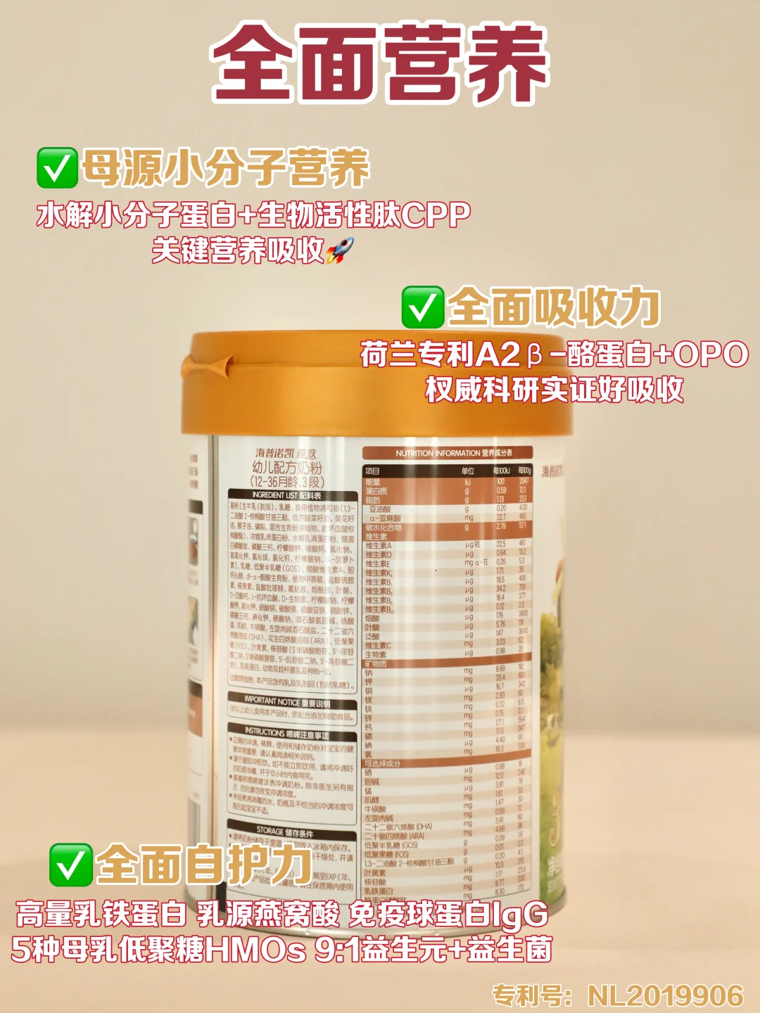 先是吸收力这块,有荷兰专利A2β-酪蛋白+OPO(专利号:NL2019906),让小肚肚舒适,吸收营养没负担,难怪我感觉Sharon长时间喝下来,肚子消化一直都很不错。