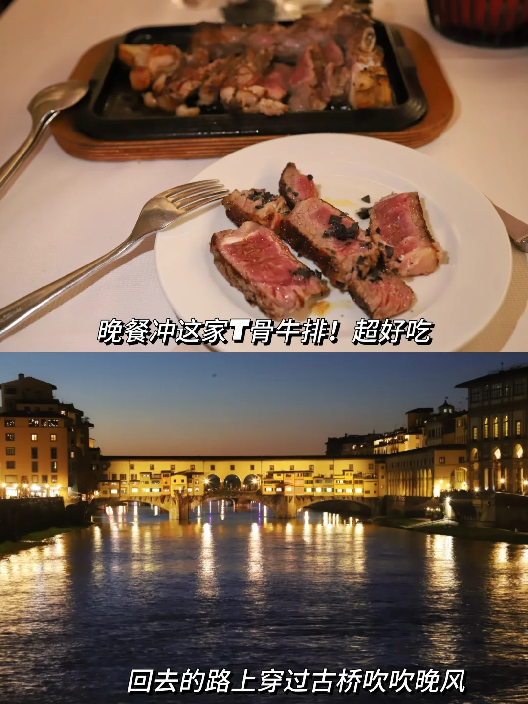 [赞R][赞R][赞R]佛罗伦萨的T骨牛排绝对不能错过!老桥旁边的Ristorante dei Rossi,好吃又不贵!谷歌地图可预约🕰️。吃完沿着老桥听听街头表演走过阿诺河结束一天旅程