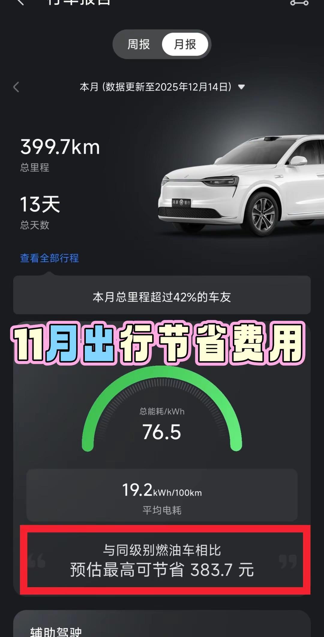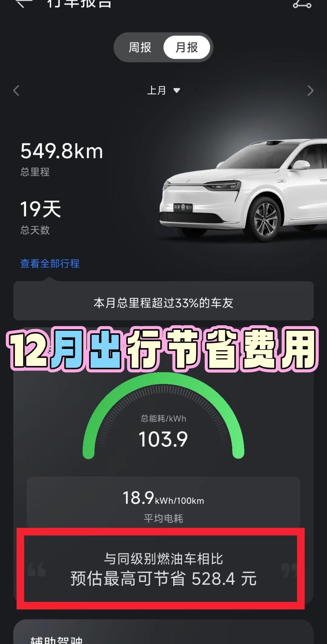 问界M7能耗账单——每一公里都算数。提车一个月,总结一下能耗和支出情况,供参考。1.整体电耗情况:共行驶964公里,百分百市区里程,平均电耗19,满电推算在500+。2.充电电费支出:11月共充电3次,共充电195度电,电费76元,平均一次20多元,算上12月的电费,一共150元左右。3.出行节省费用:与油车相比,共节省912元,结合964公里的行驶里程,大概每公里节省支出0.95元。总结:总节省-总支出=912-150=762元按照里程换算,每公里节省费用=762/964=0.79元≈8毛钱。以上为个人用车,仅供参考,离得近的可以去用户中心薅羊毛充电智享车生活 这体验很问界 又被问界圈粉了